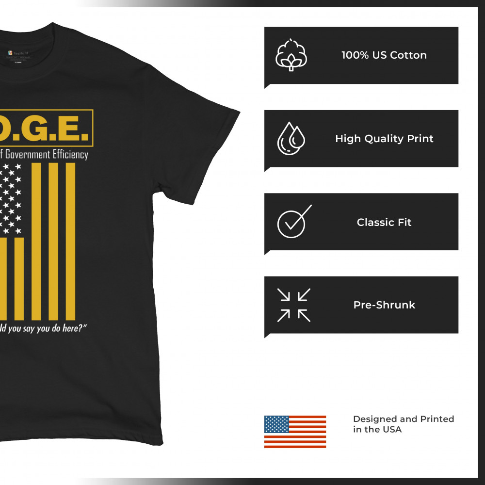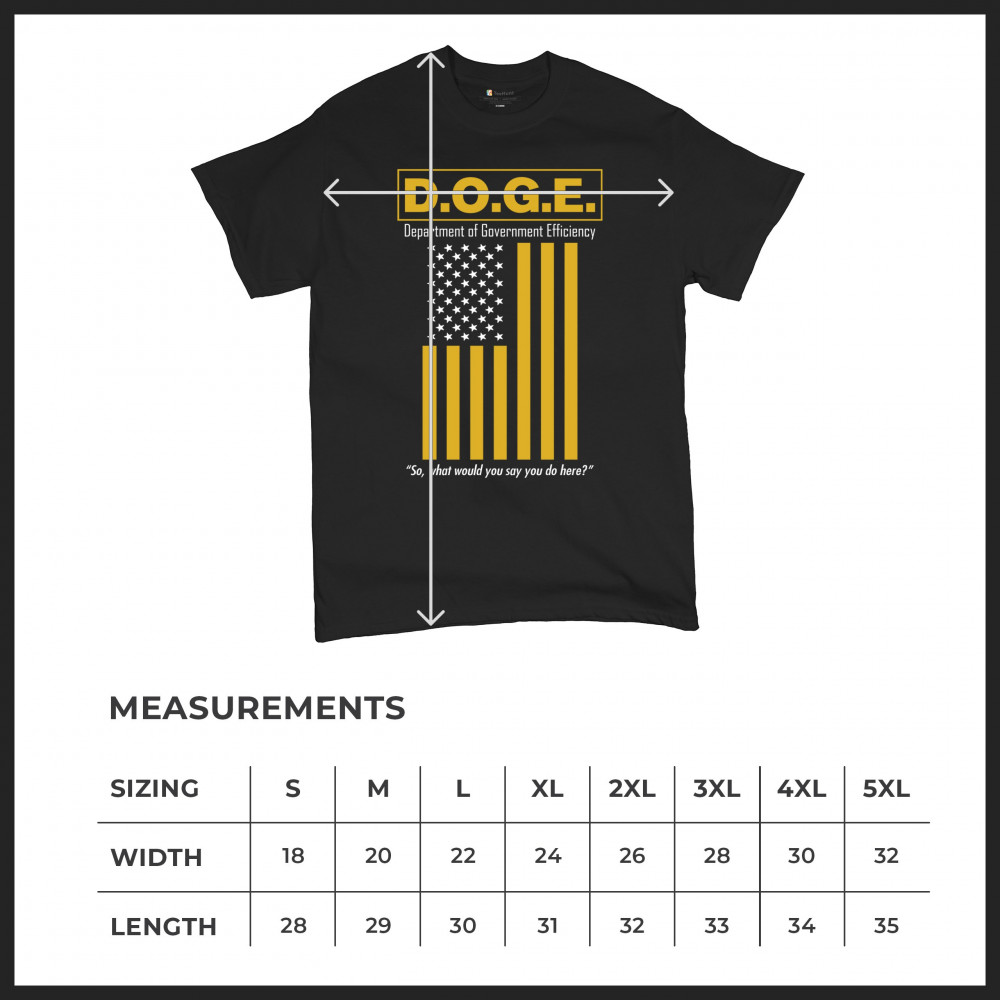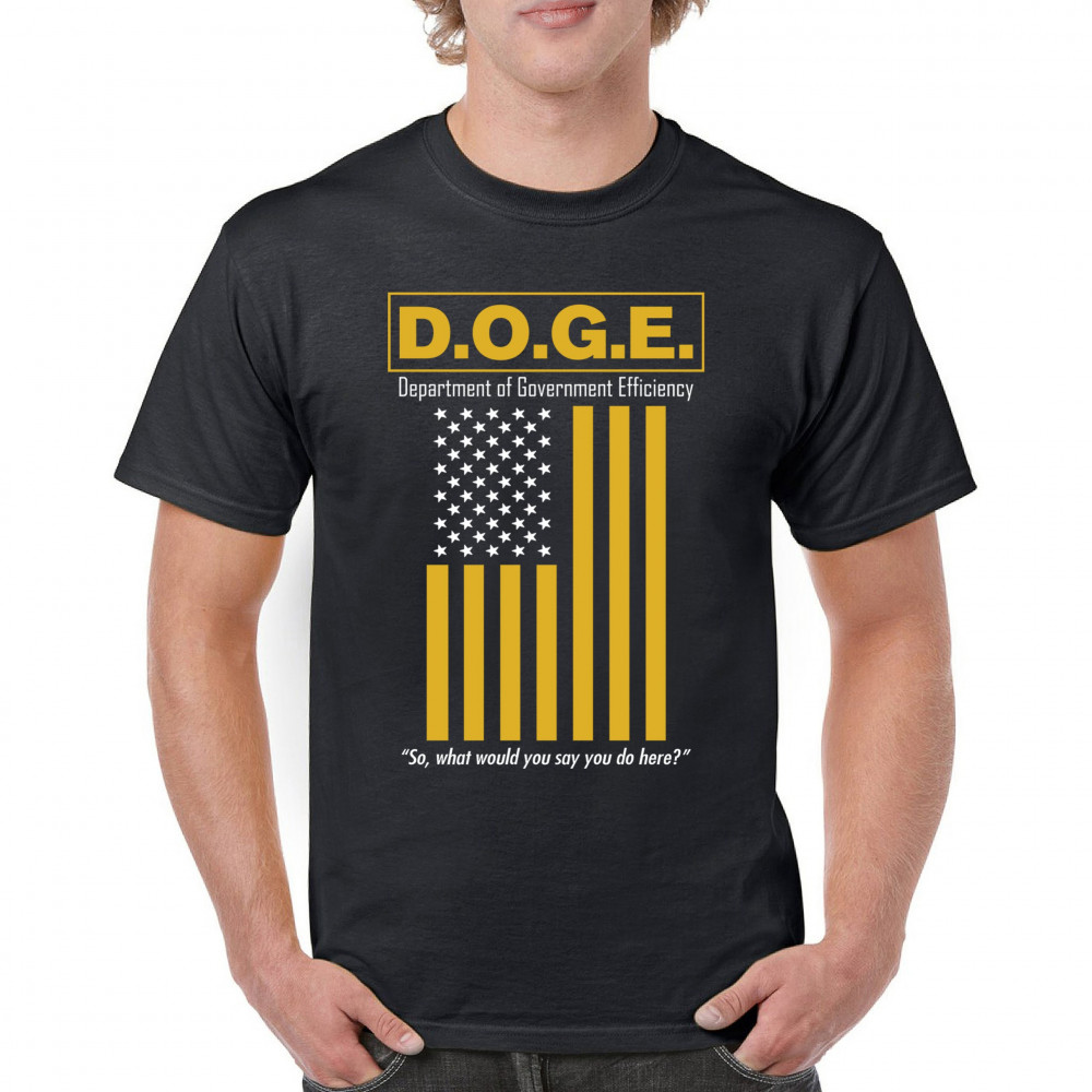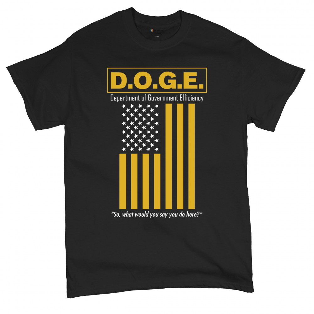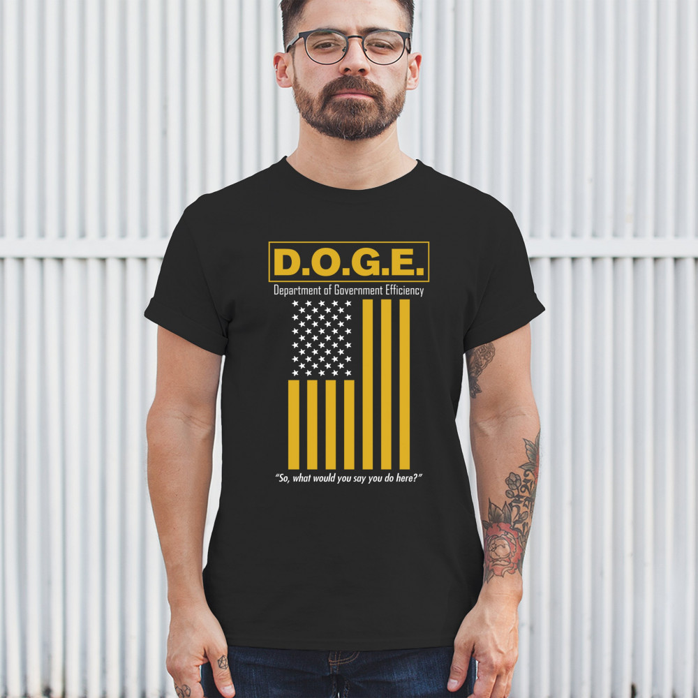The D.O.G.E. Department of Government Efficiency design features bold yellow lettering and a sarcastic punchline aimed at bloated systems. Clean typography paired with a reimagined American flag gives this political parody retro appeal. Ideal for libertarians, patriots, or anyone fed up with inefficiency and red tape.