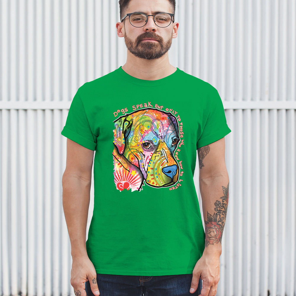 DOGS SPEAK TO THOSE WHO LISTEN t-shirt dean russo neon pet puppy men's tee green