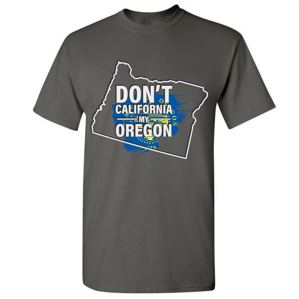 A political print featuring a silhouette of the state of Oregon and the Seal of the State of Oregon inside of it. The print says: "Don't California my Oregon". A great choice for anyone who is concerned for a huge number of Californians moving to their be