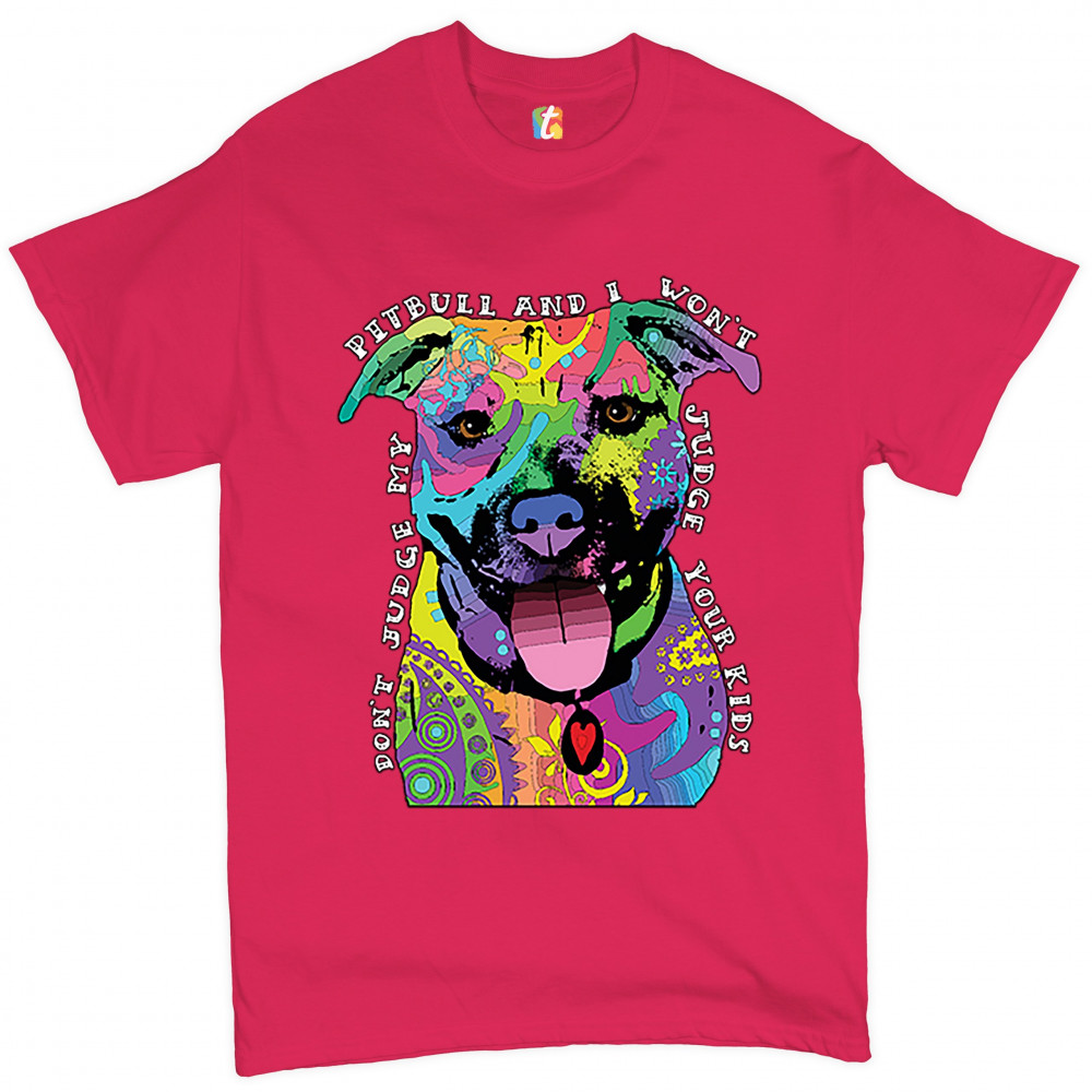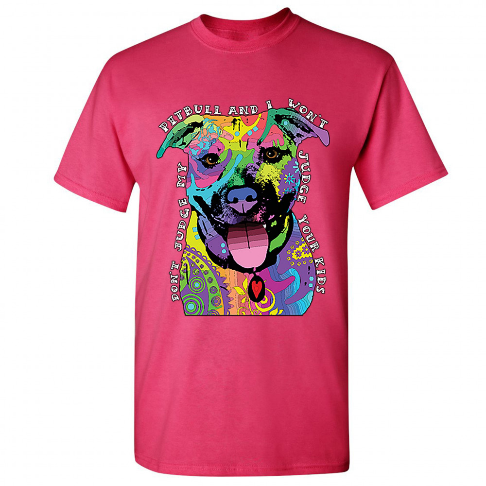 DON'T JUDGE MY PIT BULL t-shirt funny andy maxx dog lover pet owner men's tee hot pink