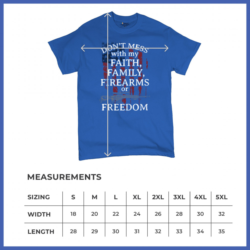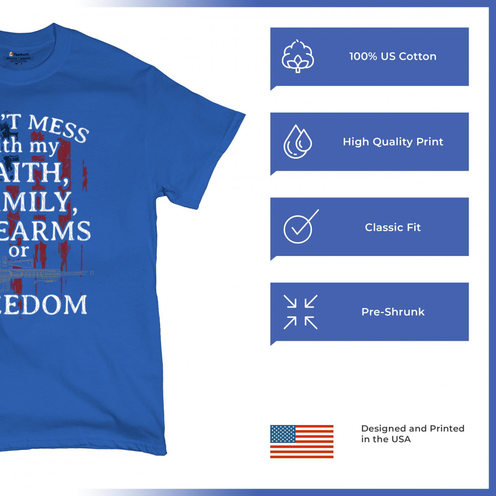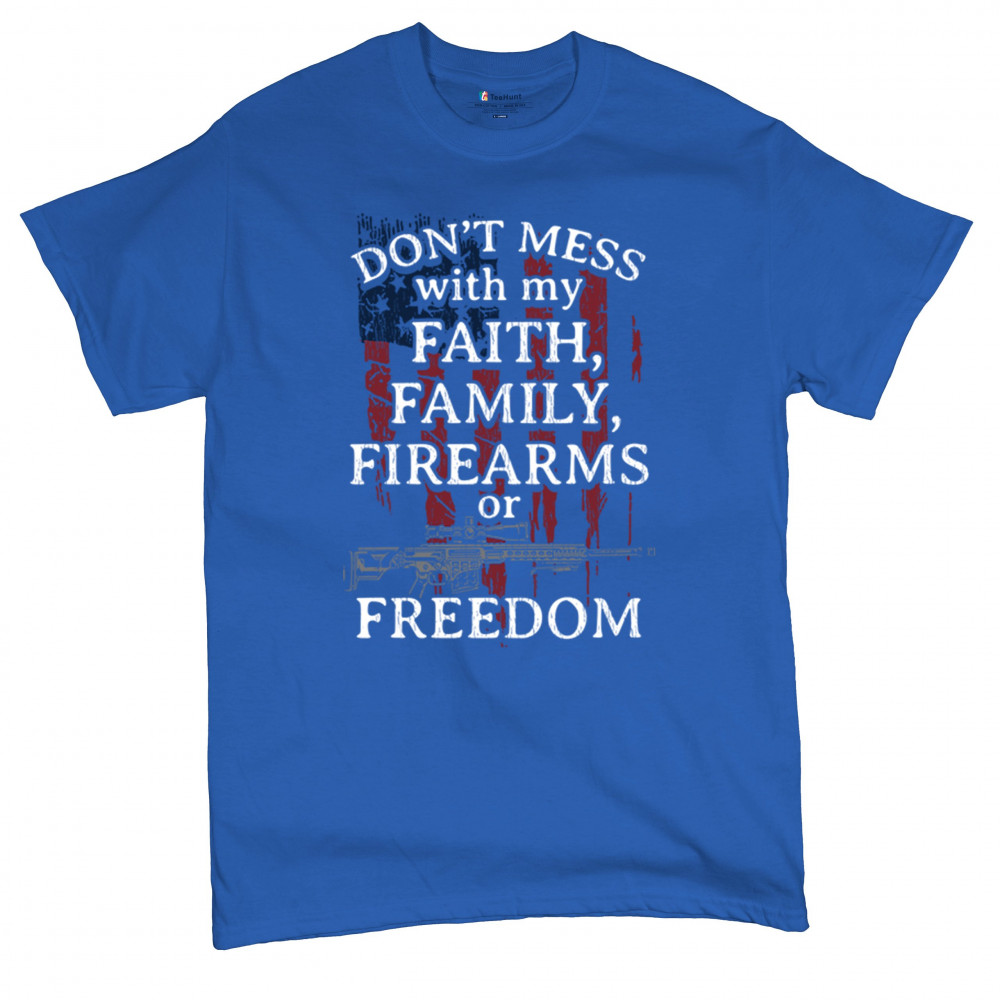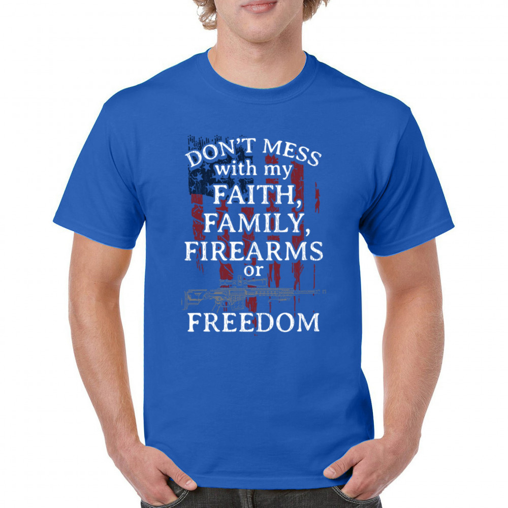 Celebrate your patriotism and core values with this powerful shirt featuring "Don't Mess with My Faith, Family, Firearms, or Freedom" set against a distressed American flag. This shirt is perfect for patriots, veterans, and those who hold their religious beliefs and the right to bear arms in high regard. Made from high-quality fabric, it ensures comfort and durability for everyday wear. Wear it proudly at patriotic events, on the 4th of July, or anytime you want to make a strong statement about your beliefs. It’s an excellent gift for anyone who shares these values and supports the American flag and the stars and stripes.
