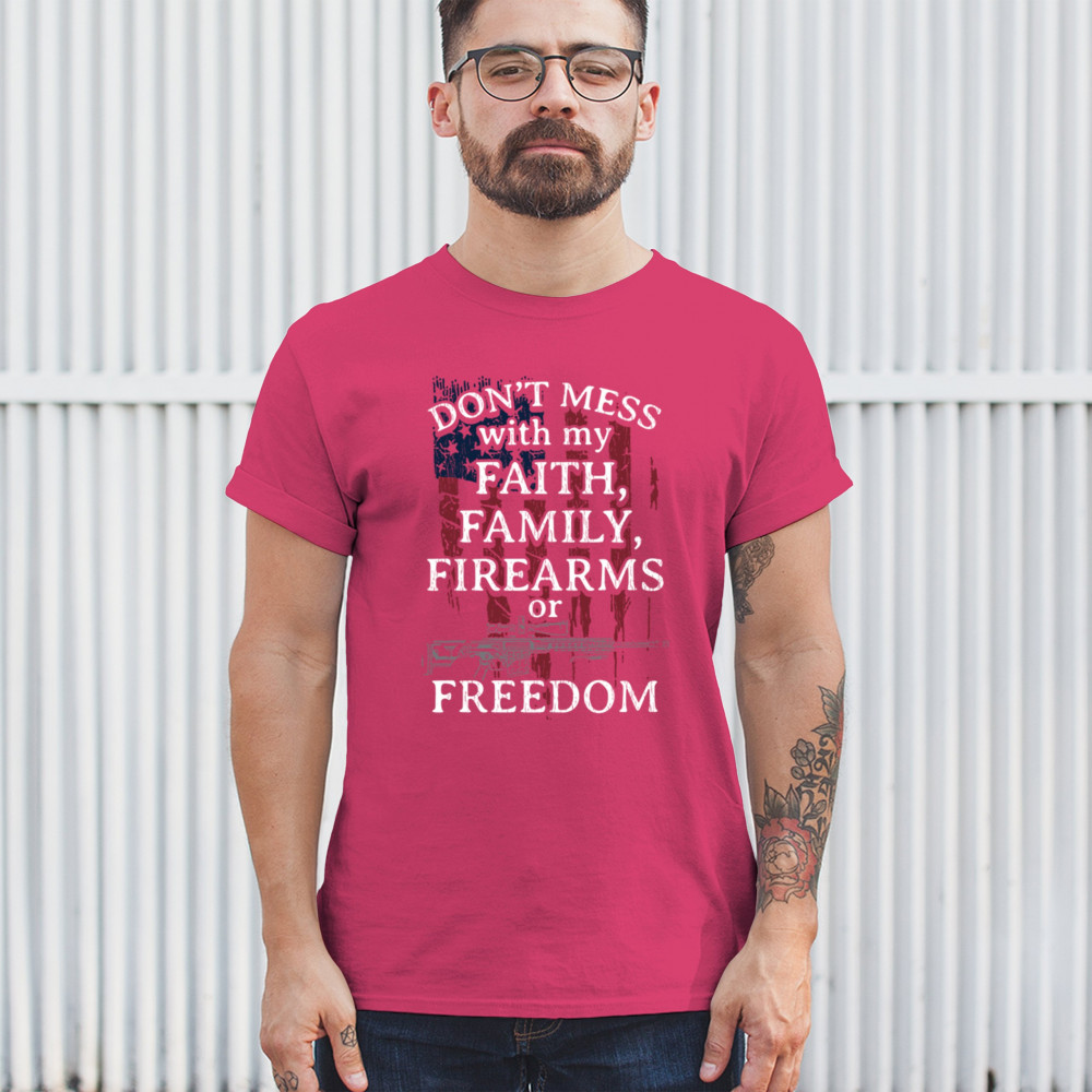 Celebrate your patriotism and core values with this powerful shirt featuring "Don't Mess with My Faith, Family, Firearms, or Freedom" set against a distressed American flag. This shirt is perfect for patriots, veterans, and those who hold their religious beliefs and the right to bear arms in high regard. Made from high-quality fabric, it ensures comfort and durability for everyday wear. Wear it proudly at patriotic events, on the 4th of July, or anytime you want to make a strong statement about your beliefs. It’s an excellent gift for anyone who shares these values and supports the American flag and the stars and stripes.