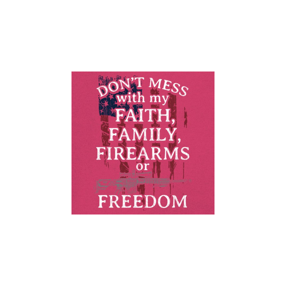 Patriotic shirt with "Don't Mess with My Faith, Family, Firearms, or Freedom" over distressed American flag. Perfect for patriots and veterans.