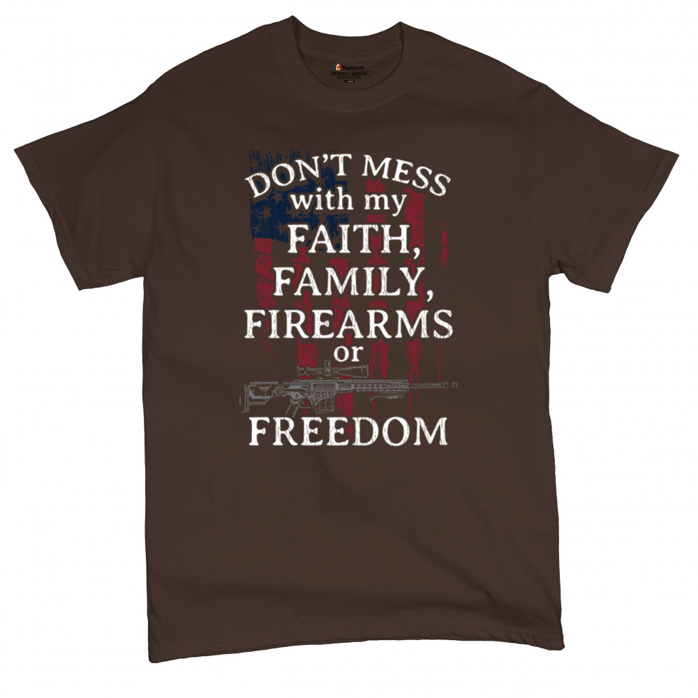 Patriotic shirt with "Don't Mess with My Faith, Family, Firearms, or Freedom" over distressed American flag. Perfect for patriots and veterans.