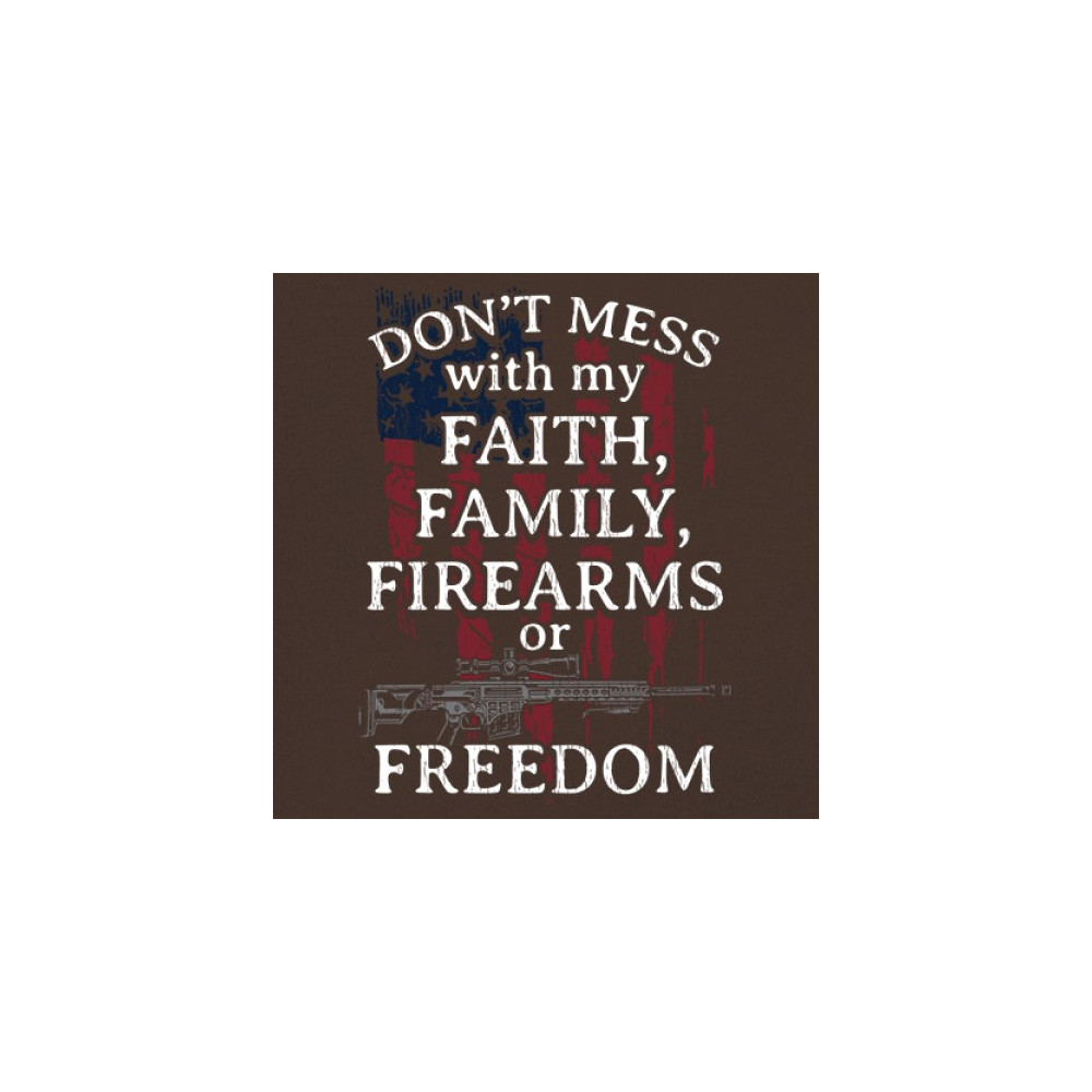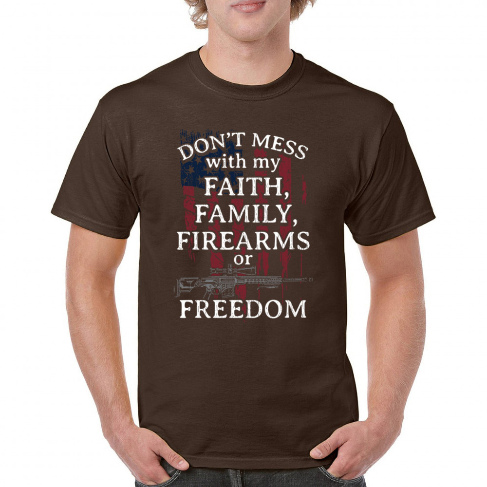 Celebrate your patriotism and core values with this powerful shirt featuring "Don't Mess with My Faith, Family, Firearms, or Freedom" set against a distressed American flag. This shirt is perfect for patriots, veterans, and those who hold their religious beliefs and the right to bear arms in high regard. Made from high-quality fabric, it ensures comfort and durability for everyday wear. Wear it proudly at patriotic events, on the 4th of July, or anytime you want to make a strong statement about your beliefs. It’s an excellent gift for anyone who shares these values and supports the American flag and the stars and stripes.