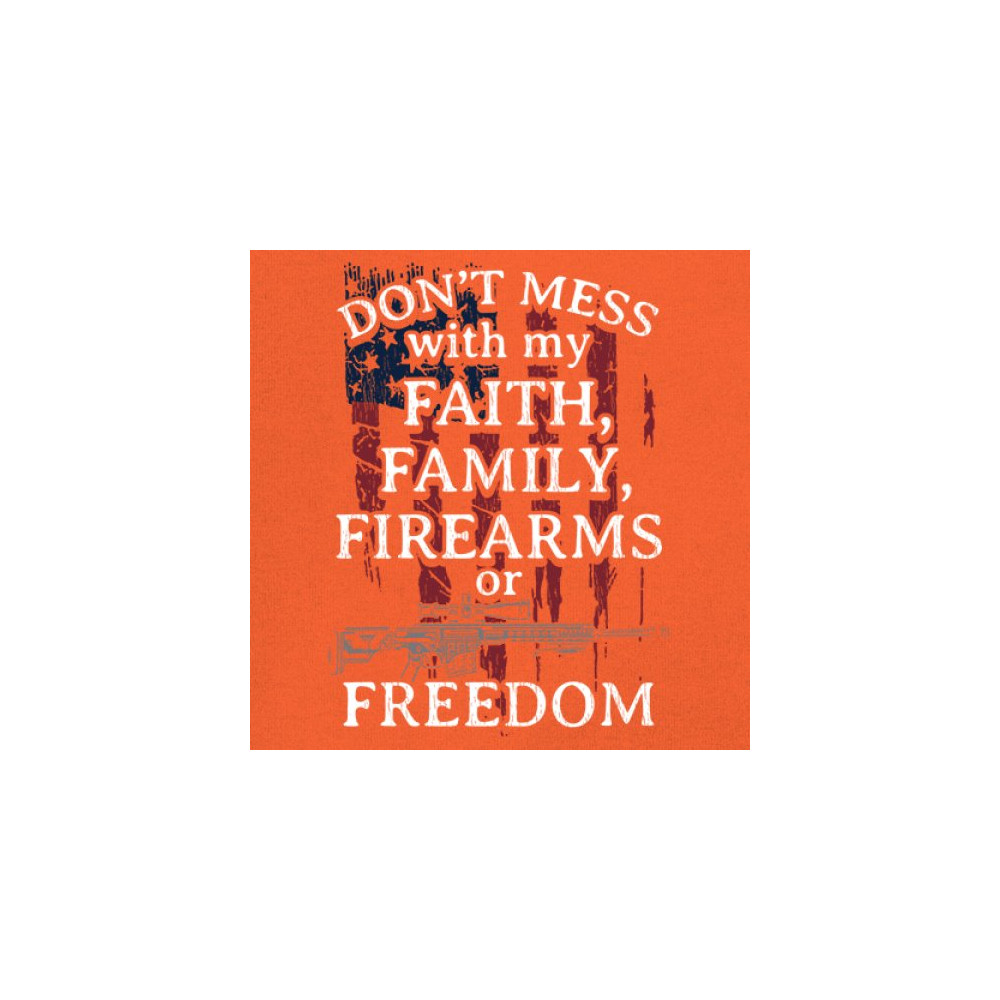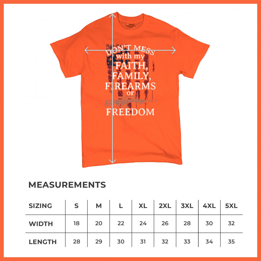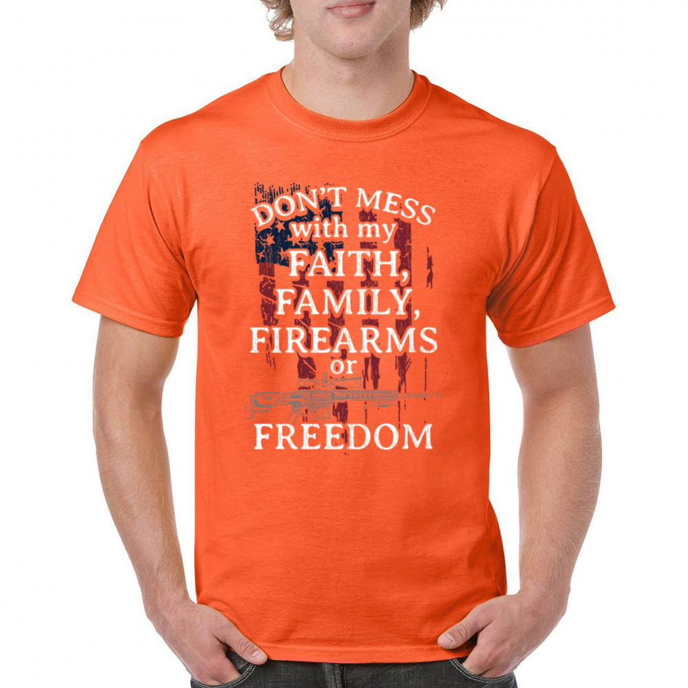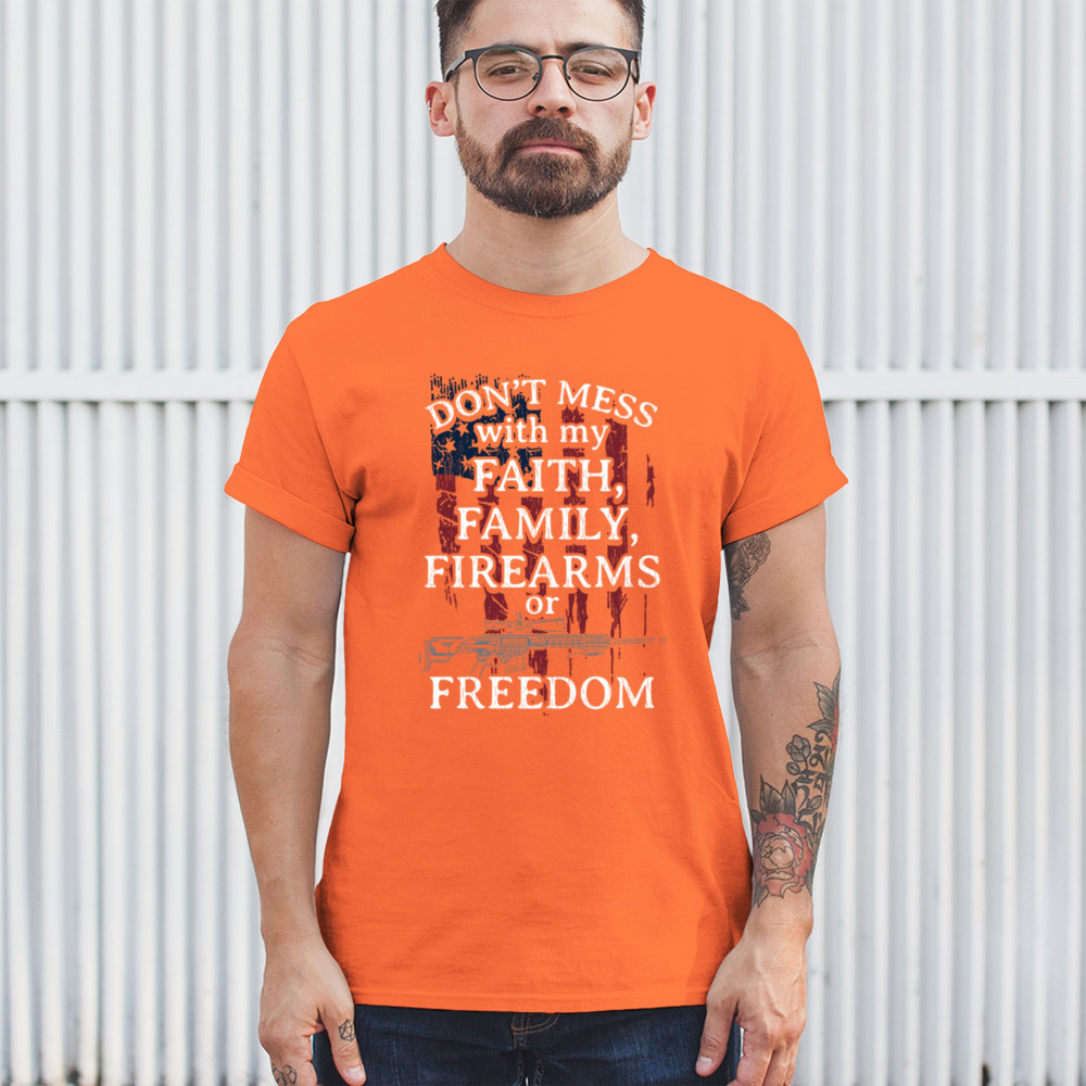 Celebrate your patriotism and core values with this powerful shirt featuring "Don't Mess with My Faith, Family, Firearms, or Freedom" set against a distressed American flag. This shirt is perfect for patriots, veterans, and those who hold their religious beliefs and the right to bear arms in high regard. Made from high-quality fabric, it ensures comfort and durability for everyday wear. Wear it proudly at patriotic events, on the 4th of July, or anytime you want to make a strong statement about your beliefs. It’s an excellent gift for anyone who shares these values and supports the American flag and the stars and stripes.