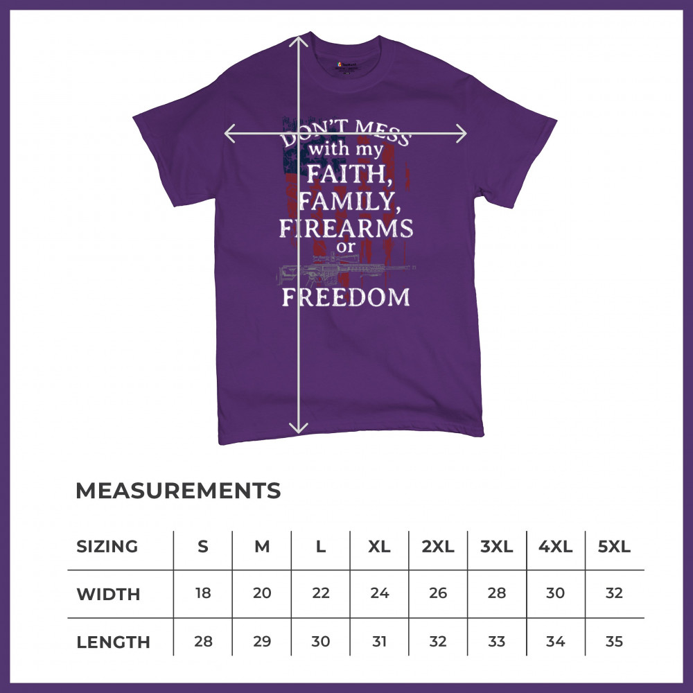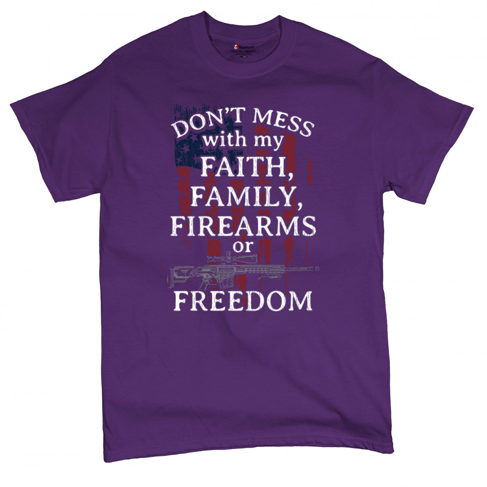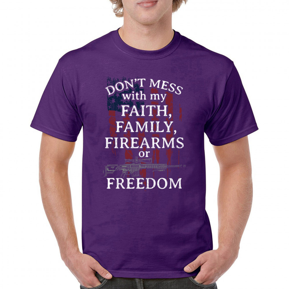 Celebrate your patriotism and core values with this powerful shirt featuring "Don't Mess with My Faith, Family, Firearms, or Freedom" set against a distressed American flag. This shirt is perfect for patriots, veterans, and those who hold their religious beliefs and the right to bear arms in high regard. Made from high-quality fabric, it ensures comfort and durability for everyday wear. Wear it proudly at patriotic events, on the 4th of July, or anytime you want to make a strong statement about your beliefs. It’s an excellent gift for anyone who shares these values and supports the American flag and the stars and stripes.