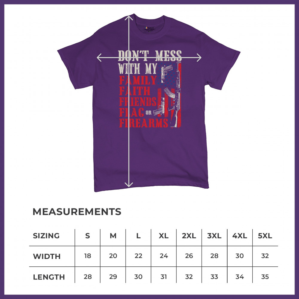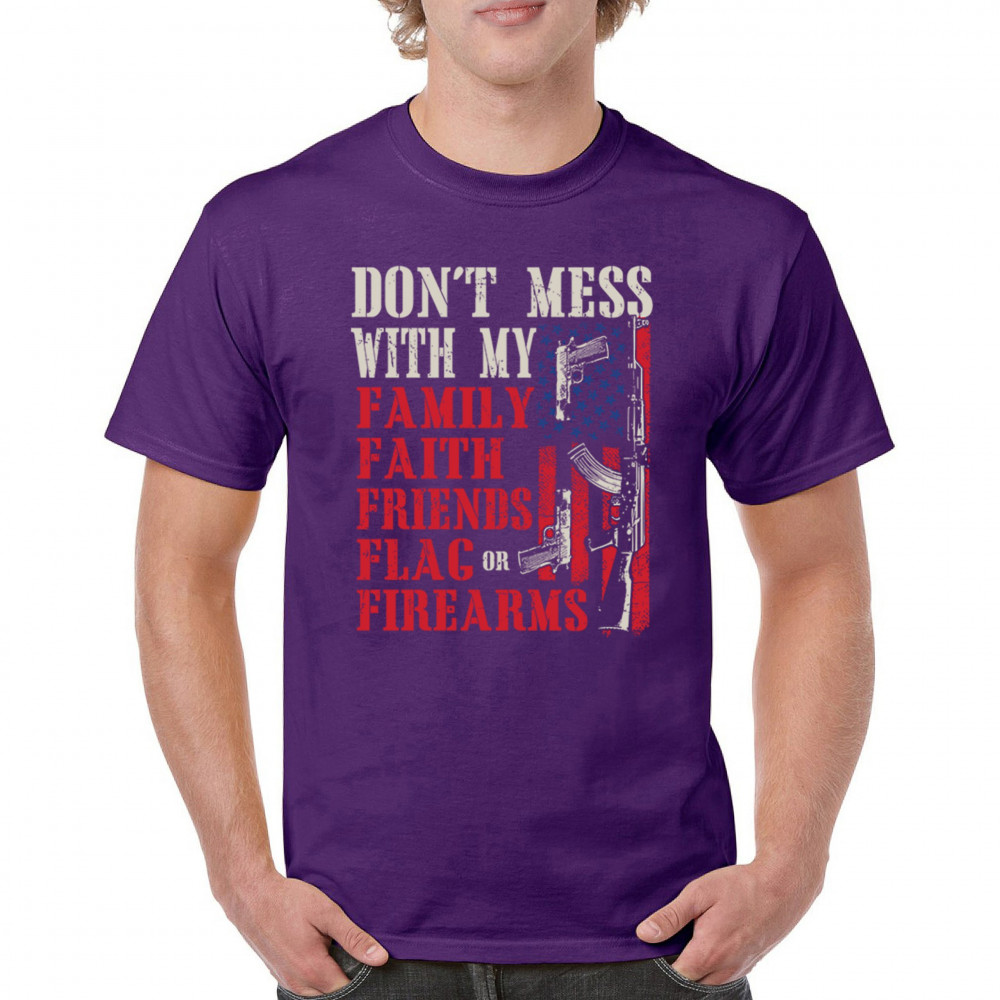 Don’t mess with a patriot’s core. This powerful design shouts loyalty to family, faith, friends, flag, and firearms. Featuring bold lettering on an American flag backdrop, it’s made for defenders of freedom, gun rights, and American values. Ideal for veterans, 2A supporters, and anyone who won’t back down from defending what they love.