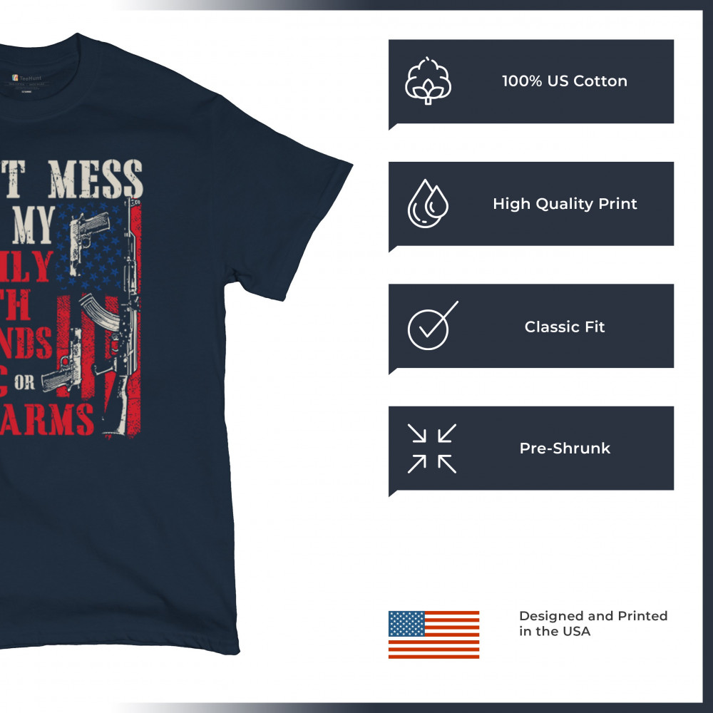 Patriotic design for gun owners and liberty-lovers. Bold message defends family, flag, and firearms with unapologetic American pride.
