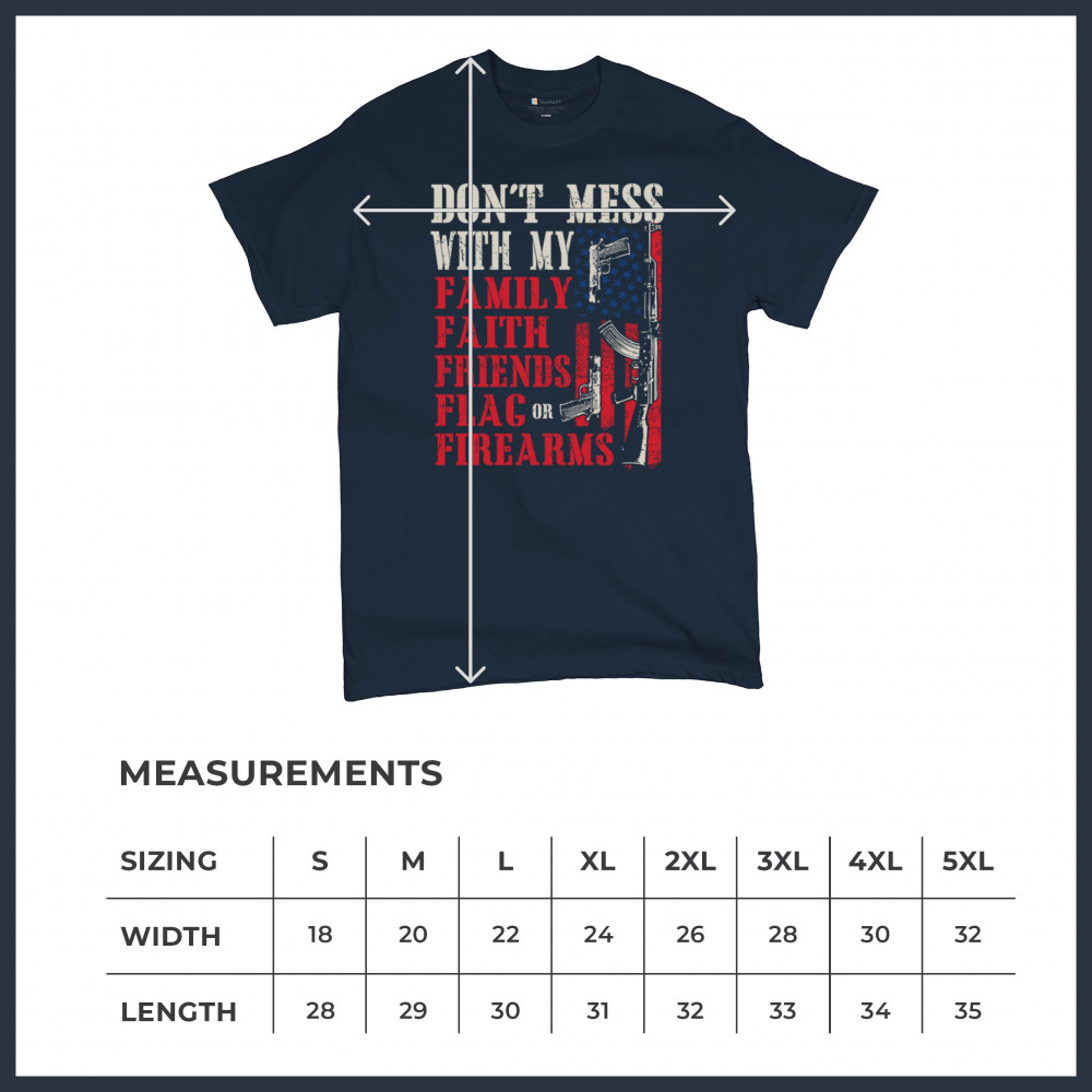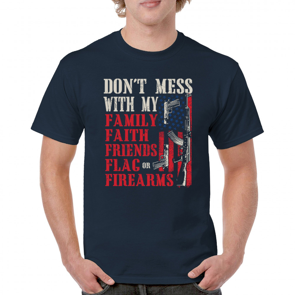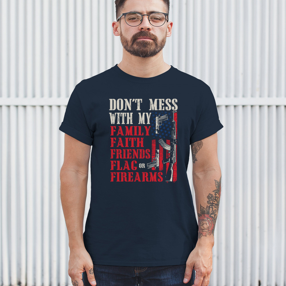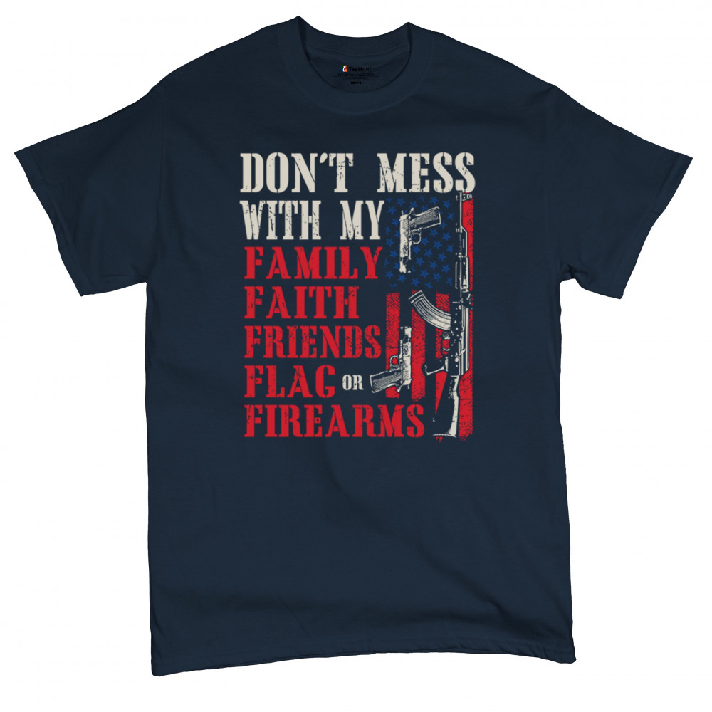 Don’t mess with a patriot’s core. This powerful design shouts loyalty to family, faith, friends, flag, and firearms. Featuring bold lettering on an American flag backdrop, it’s made for defenders of freedom, gun rights, and American values. Ideal for veterans, 2A supporters, and anyone who won’t back down from defending what they love.