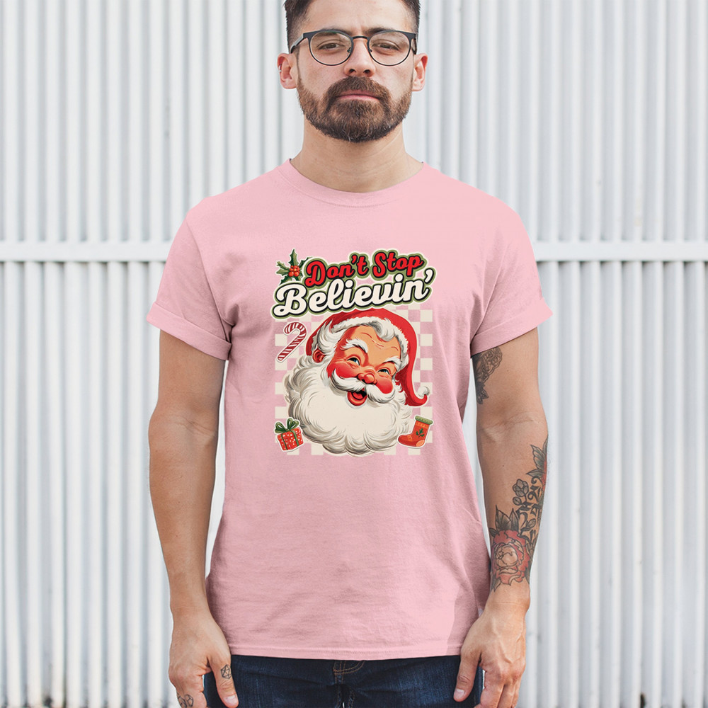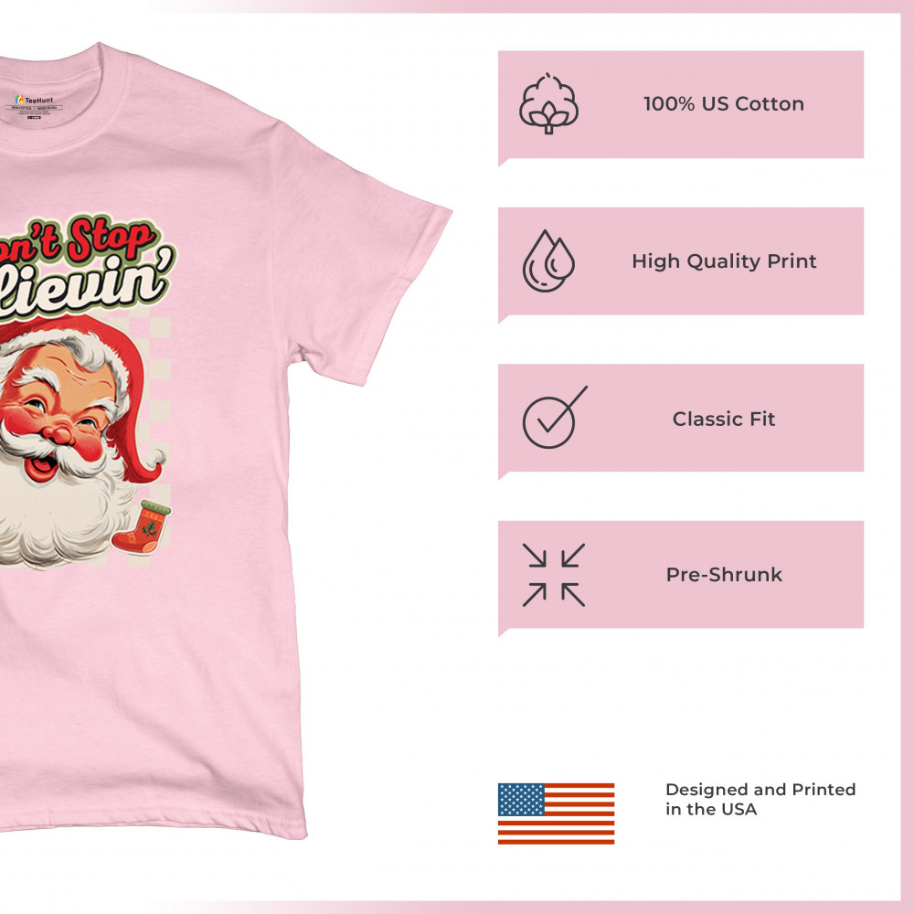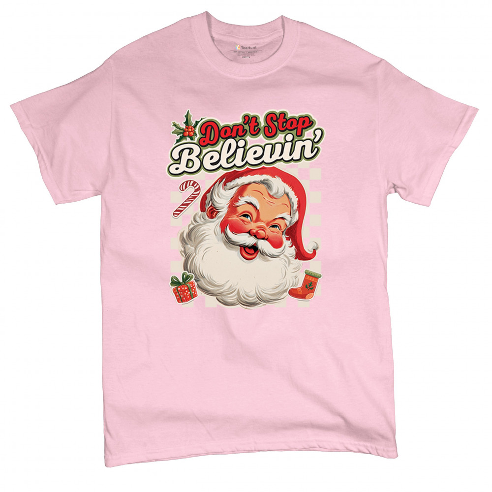 Spread holiday cheer with this “Don’t Stop Believing†Santa Claus shirt that blends classic Christmas spirit with cozy winter charm. Perfect for festive parties, family gatherings, or relaxing by the fire, this design captures Jingle Bells joy, Merry Xmas fun, Santa Claus magic, Reindeer delight, Rudolph glow, Snowman charm, and Christmas tree style for the perfect seasonal outfit.