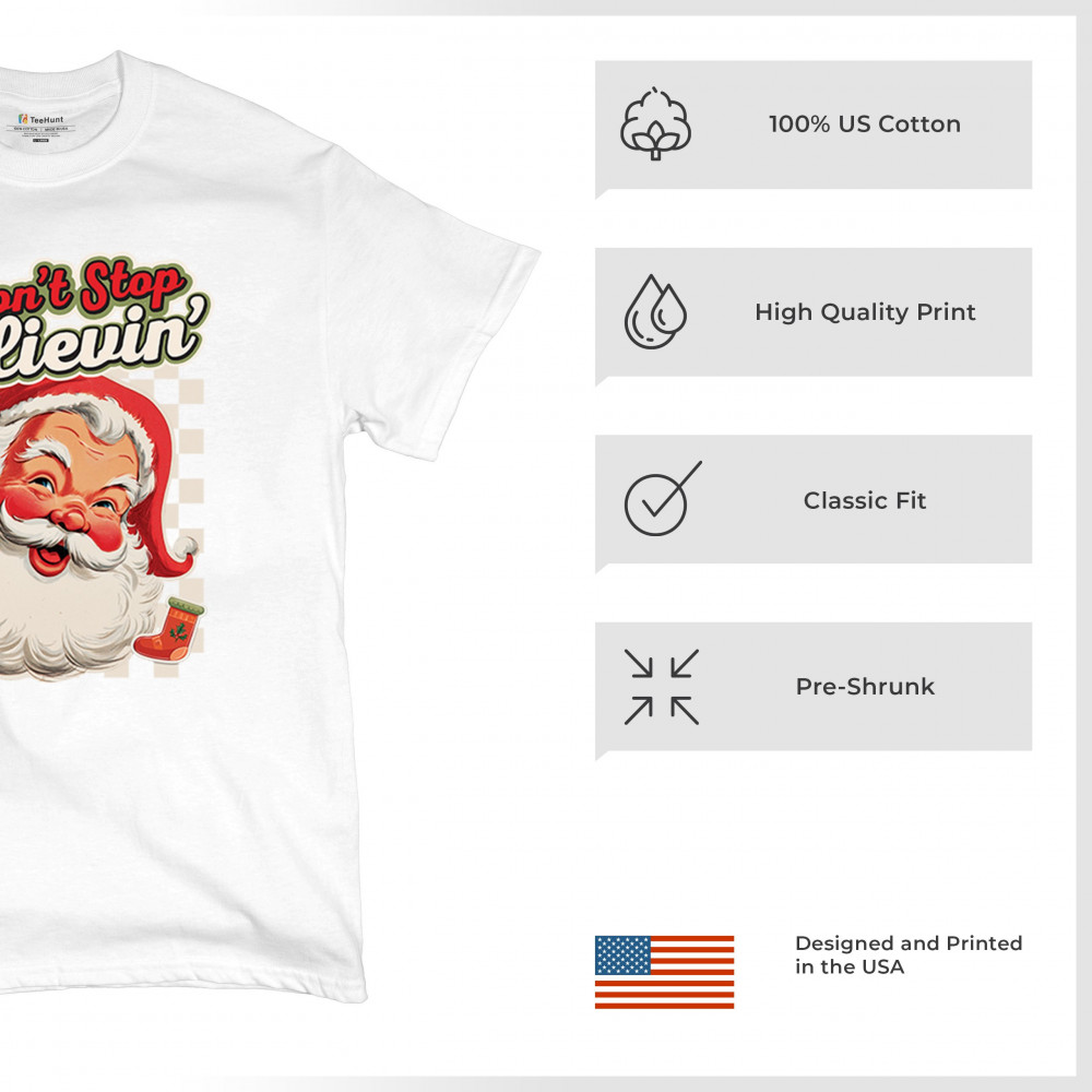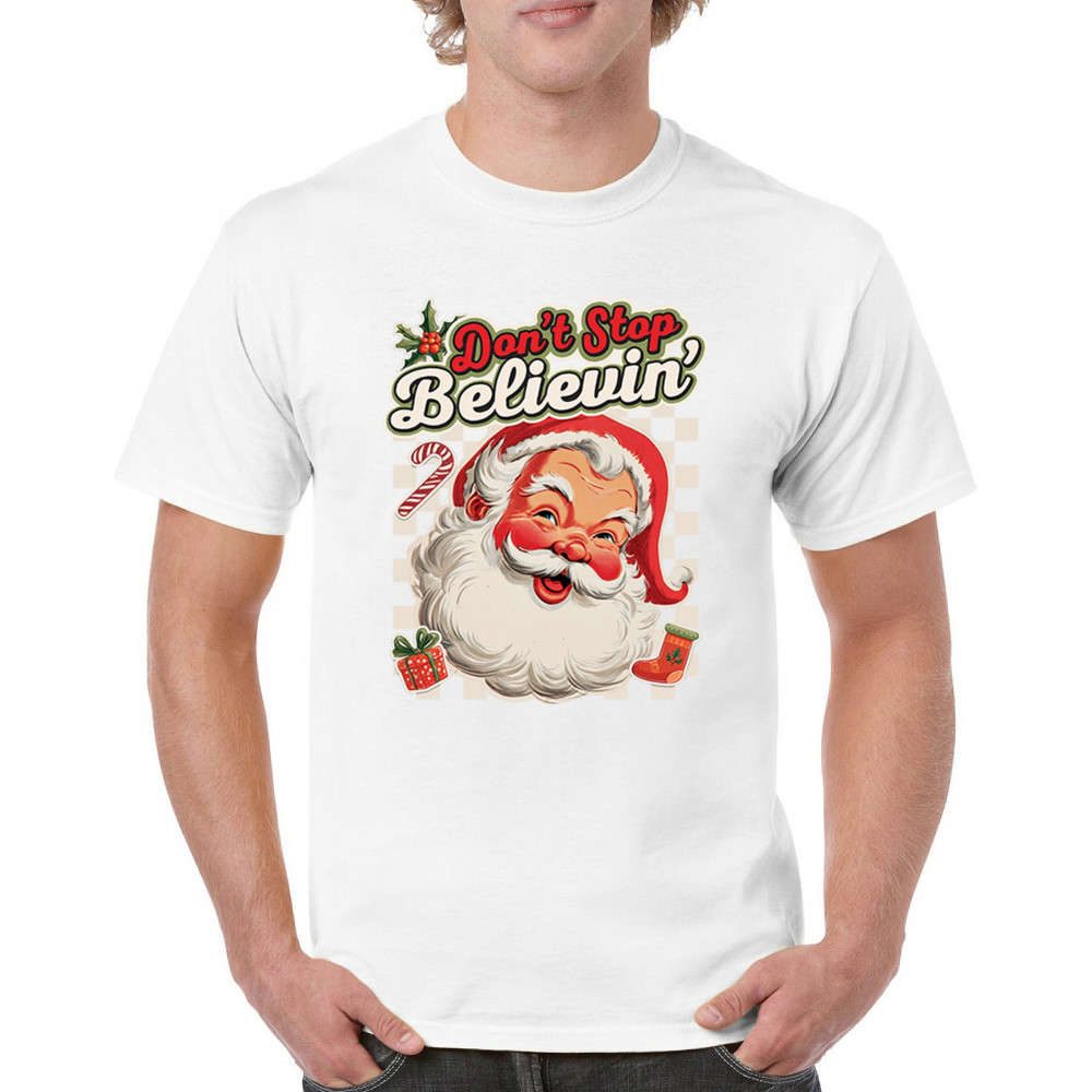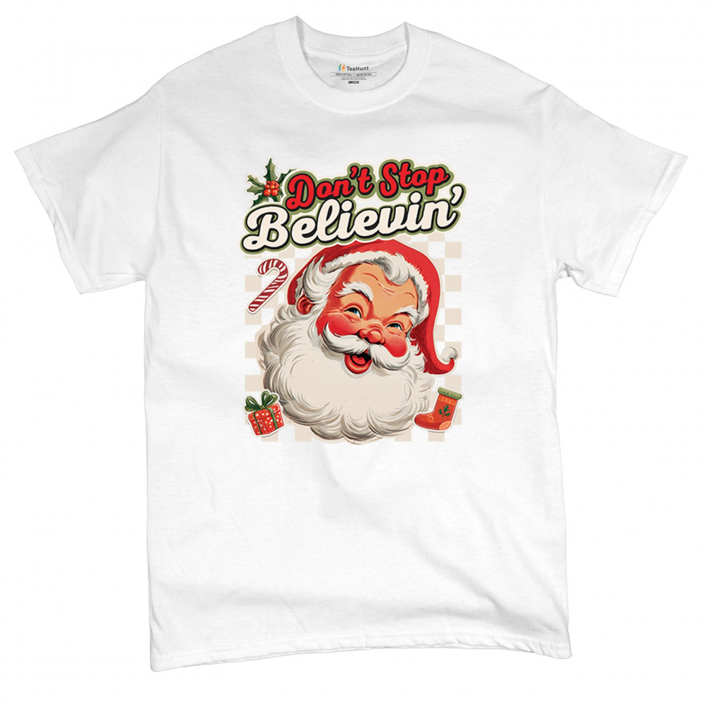 Spread holiday cheer with this “Don’t Stop Believing†Santa Claus shirt that blends classic Christmas spirit with cozy winter charm. Perfect for festive parties, family gatherings, or relaxing by the fire, this design captures Jingle Bells joy, Merry Xmas fun, Santa Claus magic, Reindeer delight, Rudolph glow, Snowman charm, and Christmas tree style for the perfect seasonal outfit.