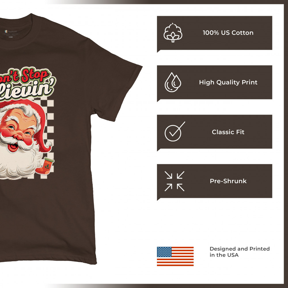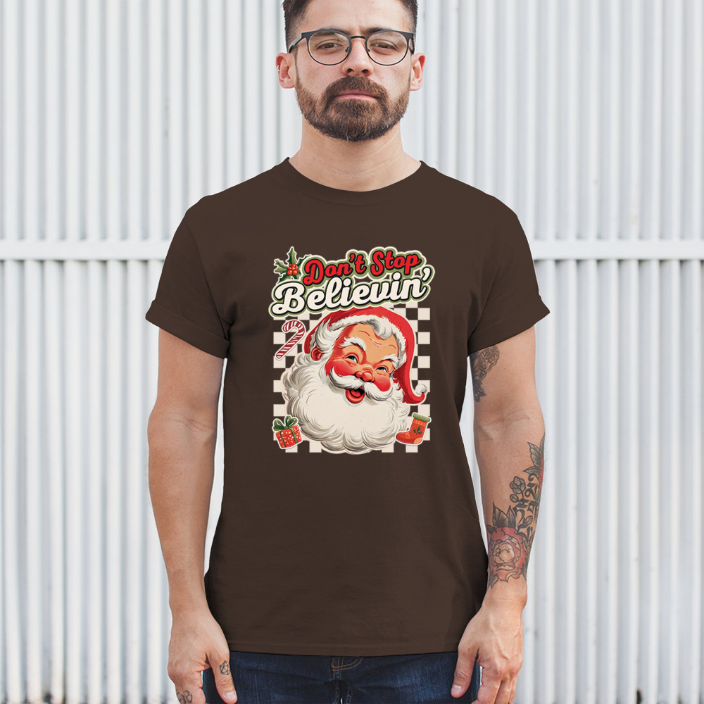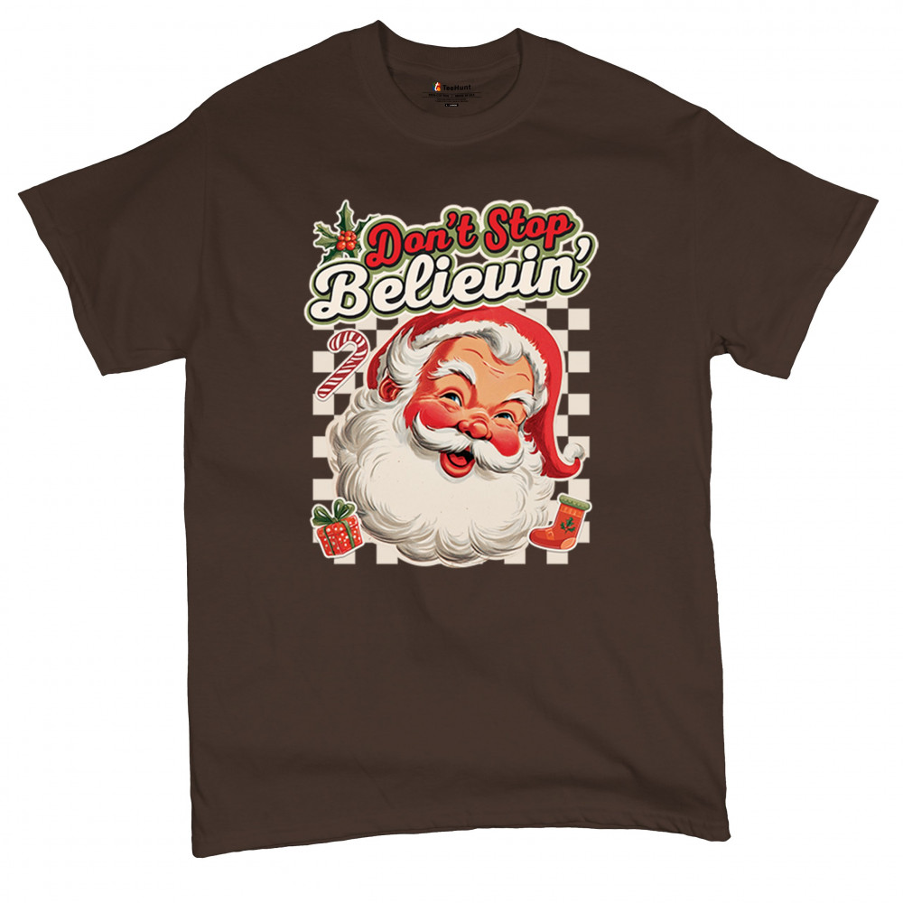 Spread holiday cheer with this “Don’t Stop Believing†Santa Claus shirt that blends classic Christmas spirit with cozy winter charm. Perfect for festive parties, family gatherings, or relaxing by the fire, this design captures Jingle Bells joy, Merry Xmas fun, Santa Claus magic, Reindeer delight, Rudolph glow, Snowman charm, and Christmas tree style for the perfect seasonal outfit.