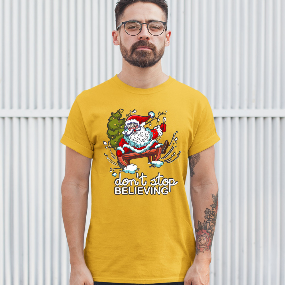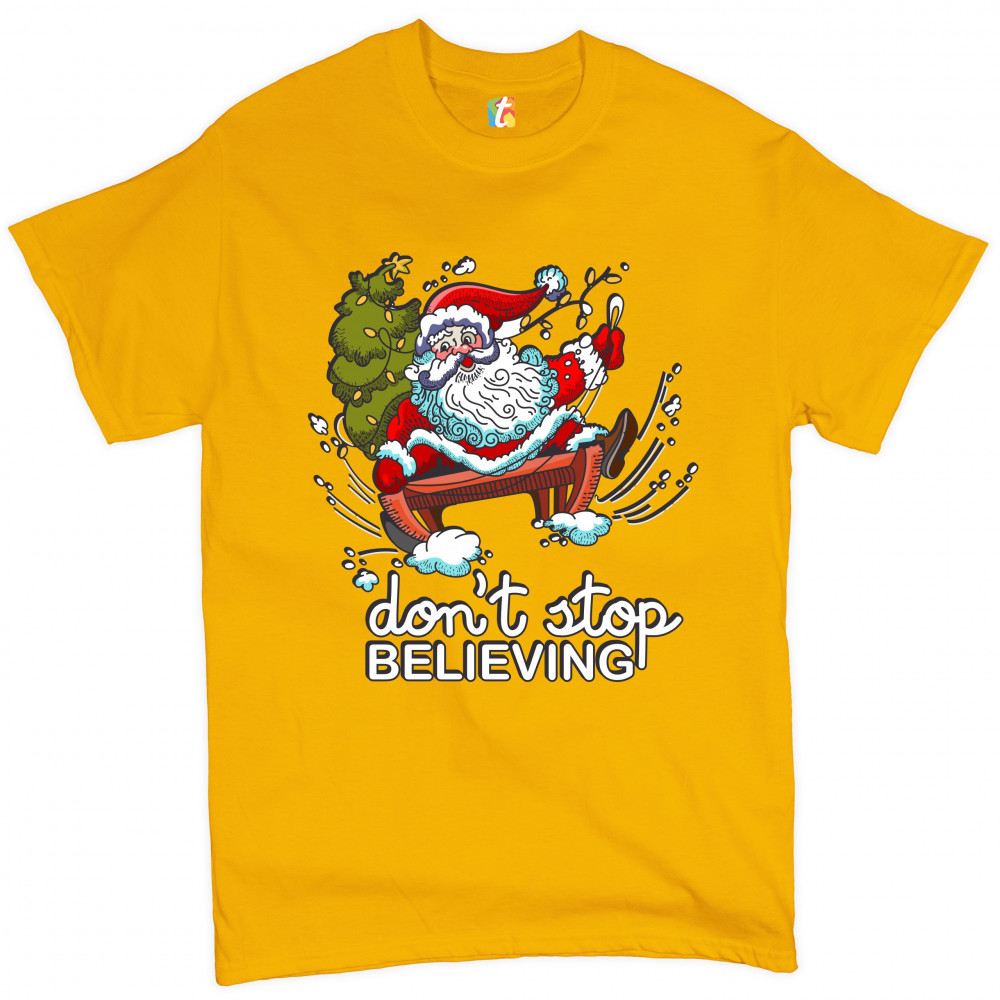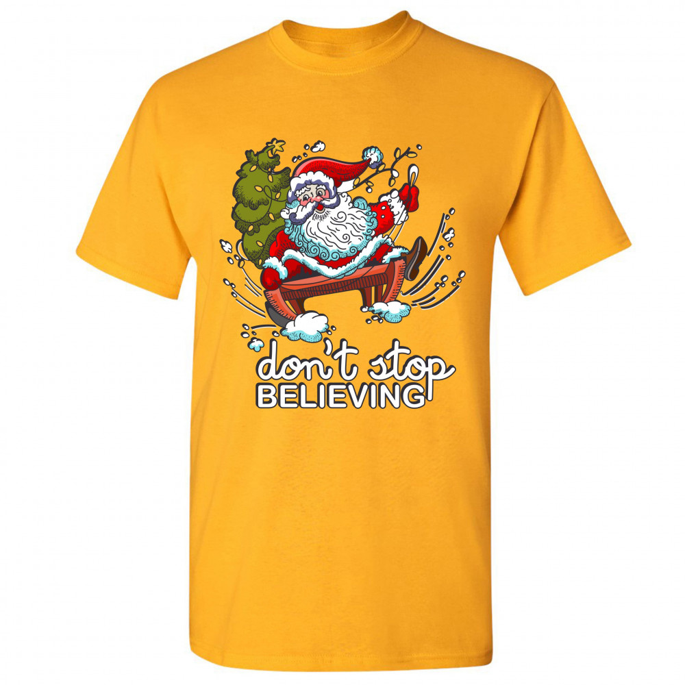 DON'T STOP BELIEVING t-shirt christmas holiday spirit santa claus men's tee yellow