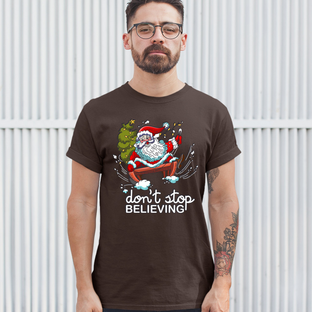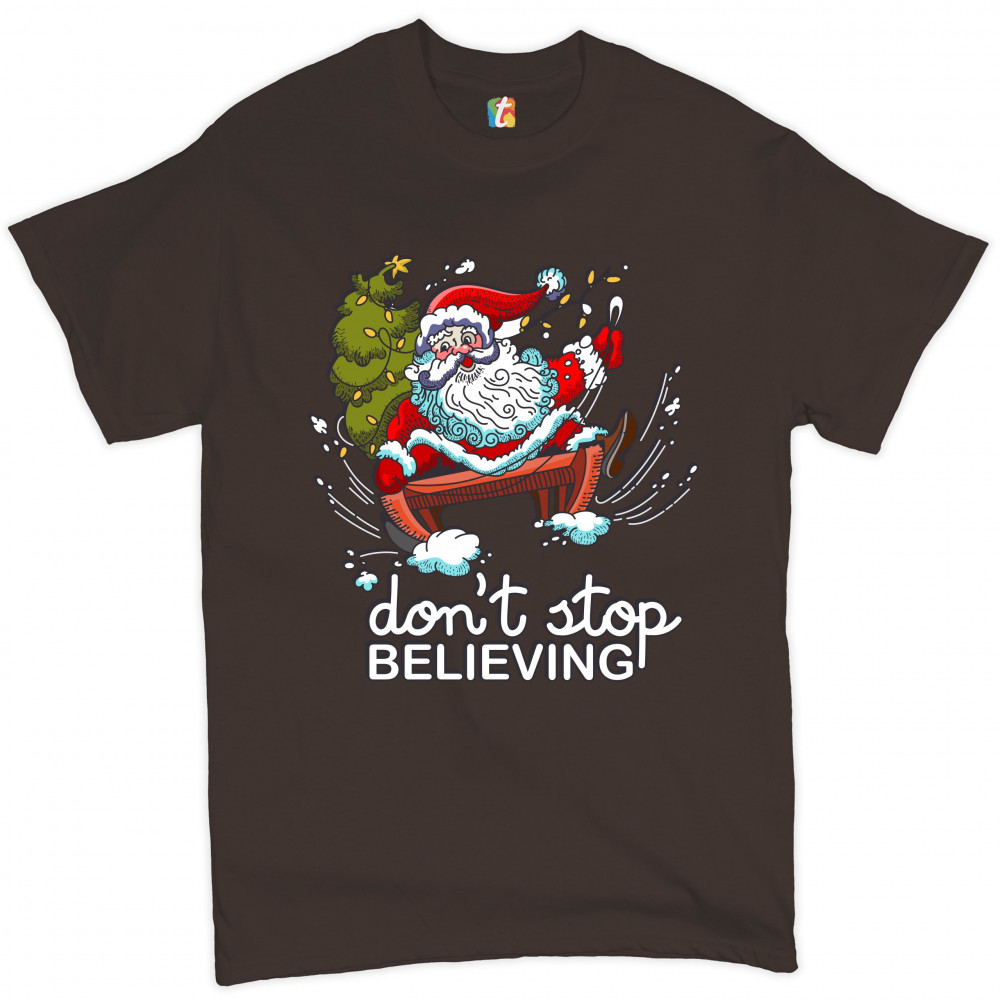 DON'T STOP BELIEVING t-shirt christmas holiday spirit santa claus men's tee brown