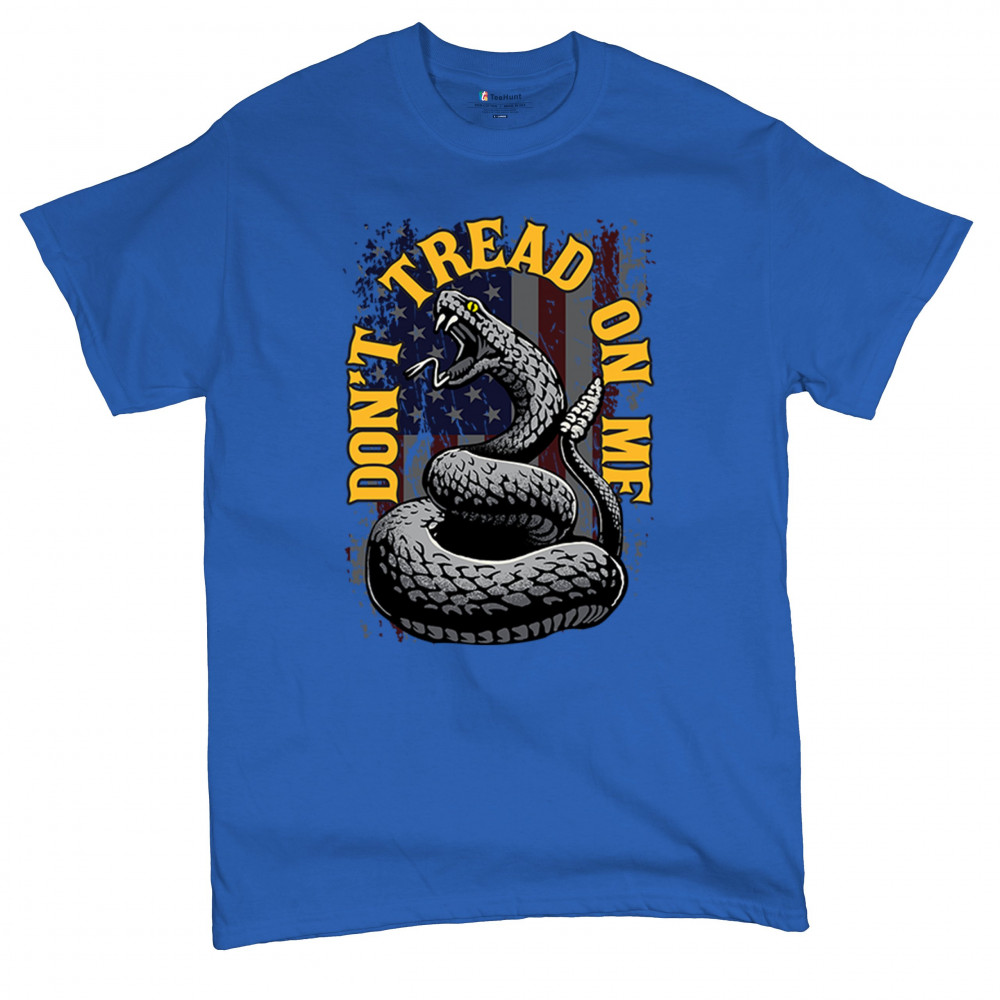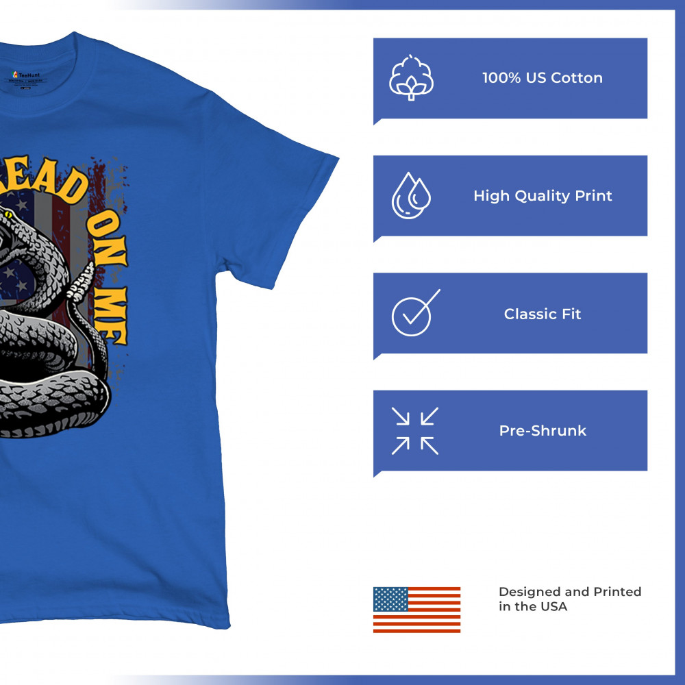 Bold "Don't Tread on Me" design with snake and American flag. Ideal for patriots. Show your love for freedom and independence.