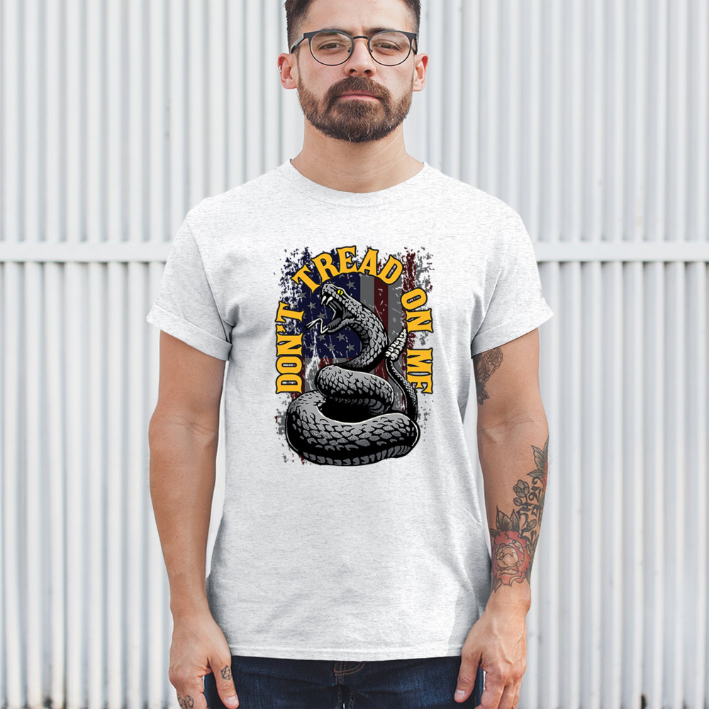 Our "Don't Tread on Me" design is perfect for anyone who values American liberty. Featuring a coiled snake against the backdrop of the American flag, this design is both striking and symbolic. Ideal for Independence Day, political events, or everyday wear, it's crafted from premium materials for comfort and durability. Make a bold statement about your commitment to freedom and independence with this powerful design. A perfect addition to any patriotic wardrobe.