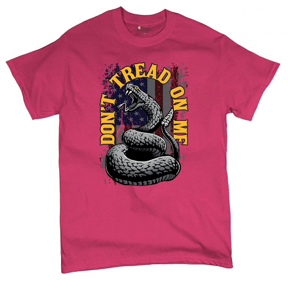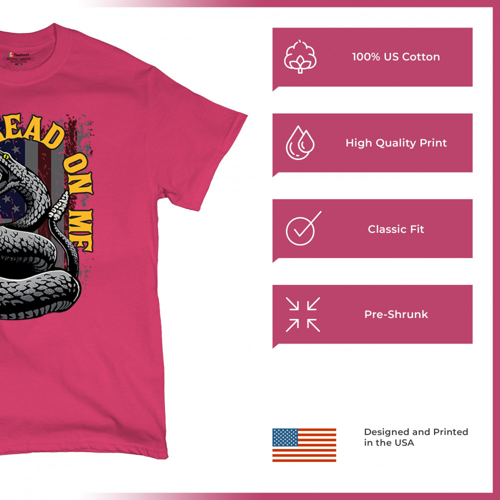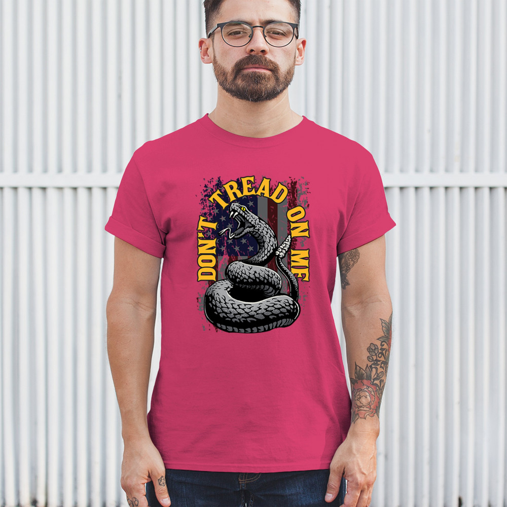 Bold "Don't Tread on Me" design with snake and American flag. Ideal for patriots. Show your love for freedom and independence.
