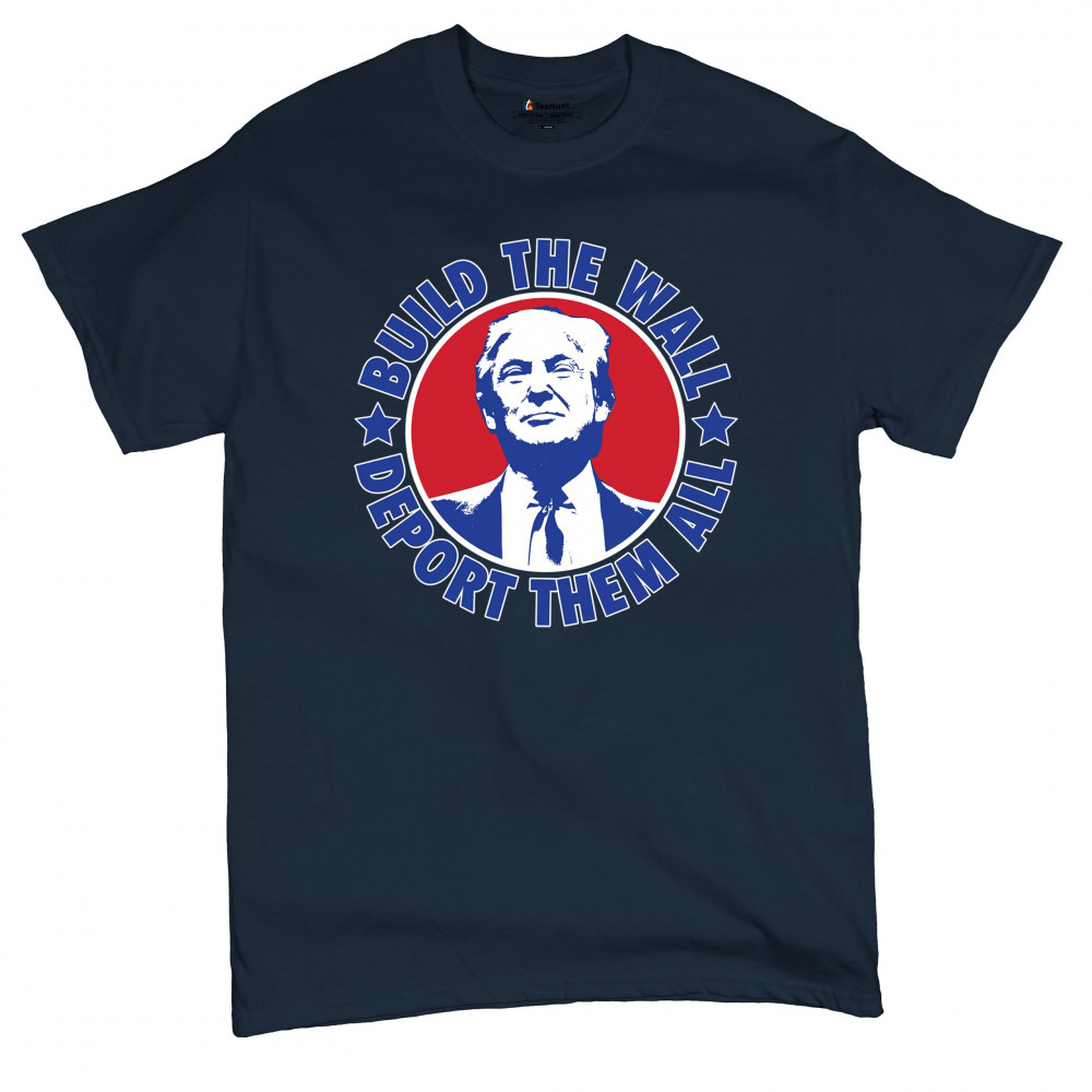Showcase your unwavering support with a bold design that champions America first. Featuring the "Build the Wall Deport Them All Trump 2024" message, this piece is a must-have for conservatives, symbolizing trust in God over government, and a commitment to never surrender. Adorned with the American flag and a call to rebelution, it's perfect for any Trump supporter ready to stand against the tide.