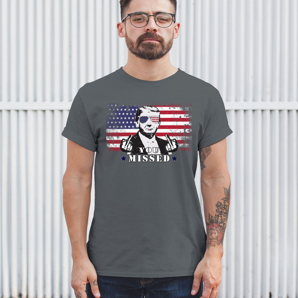 Embrace the spirit of patriotism and resilience with this powerful design showcasing Donald Trump in bold American flag sunglasses. Ideal for Trump rallies, political gatherings, and other patriotic events, this graphic is perfect for conservatives and Republicans alike. Show your unwavering support for Trump and the belief in making America great again. This striking design is not only a great addition to your wardrobe but also an excellent gift for fellow supporters. Wear it with pride and join the movement today.