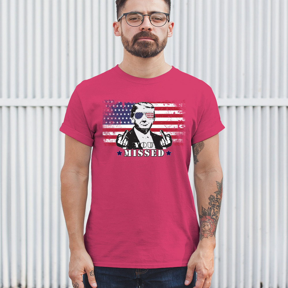 Embrace the spirit of patriotism and resilience with this powerful design showcasing Donald Trump in bold American flag sunglasses. Ideal for Trump rallies, political gatherings, and other patriotic events, this graphic is perfect for conservatives and Republicans alike. Show your unwavering support for Trump and the belief in making America great again. This striking design is not only a great addition to your wardrobe but also an excellent gift for fellow supporters. Wear it with pride and join the movement today.