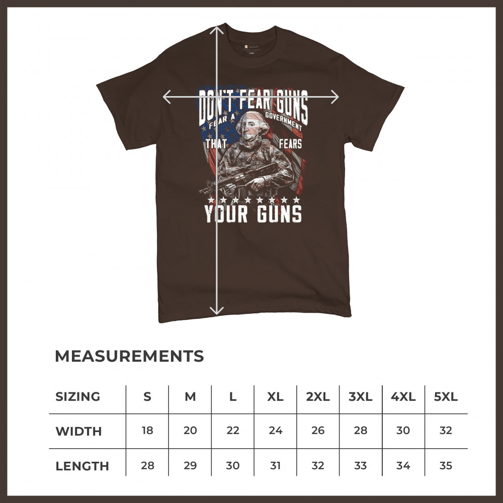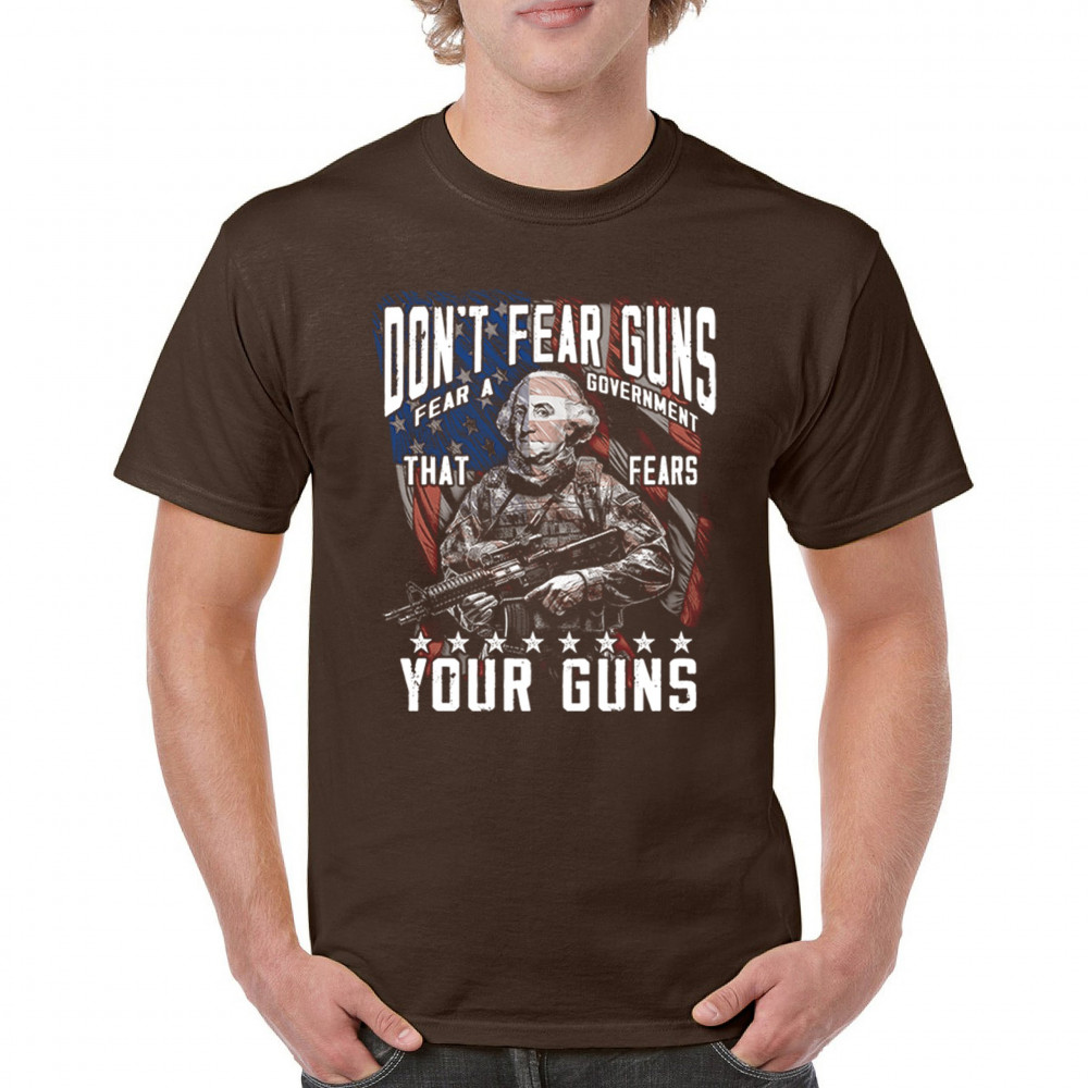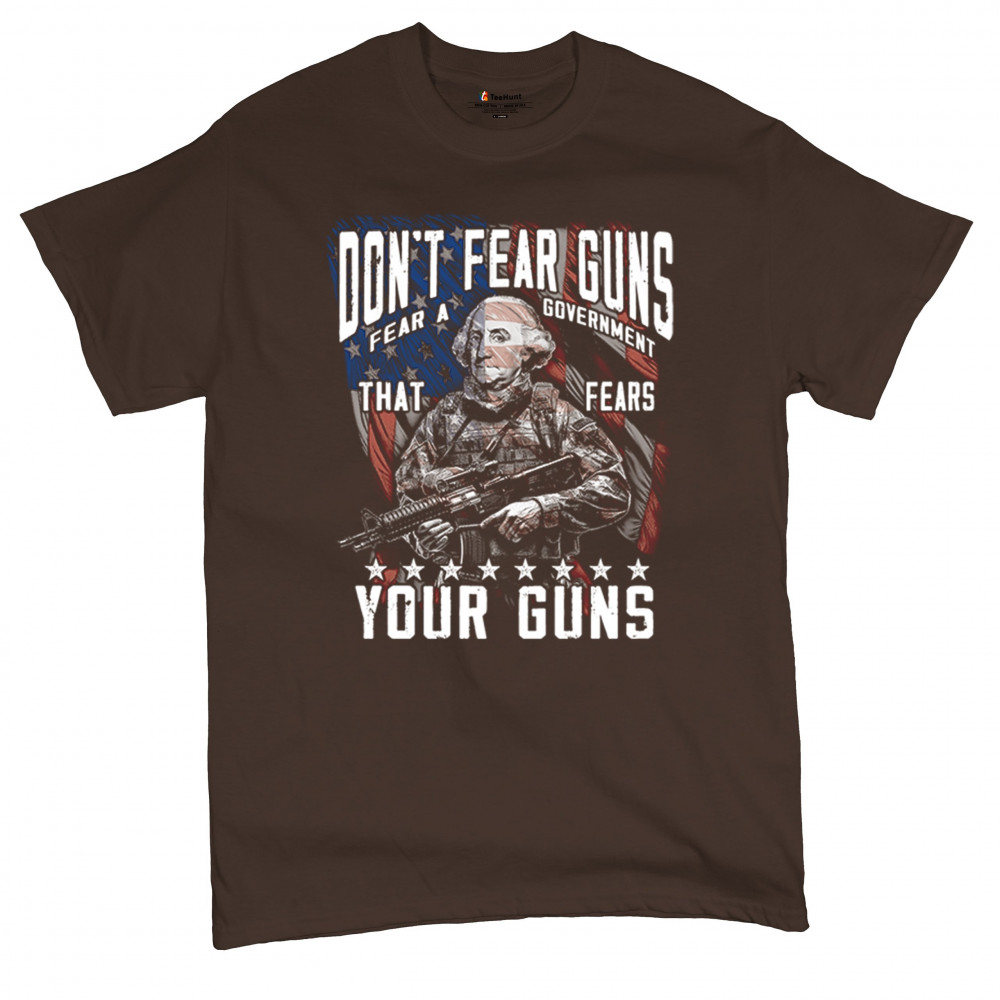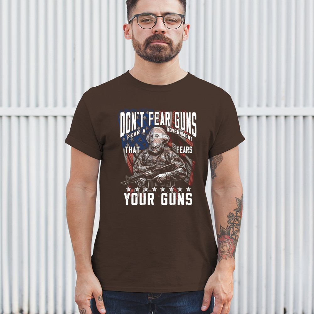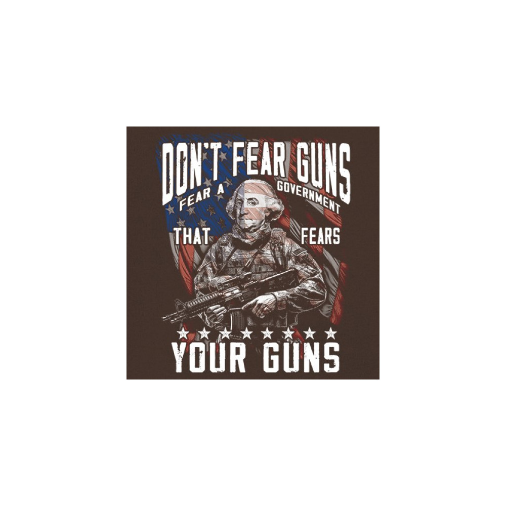 A fierce tribute to liberty, this design shows George Washington armed in tactical gear with the message "Don't Fear Guns, Fear a Government That Fears Your Guns." Perfect for 2nd Amendment patriots, protestors, and anyone who believes in self-defense and personal freedom. A bold, graphic statement for gun rights and political awareness.