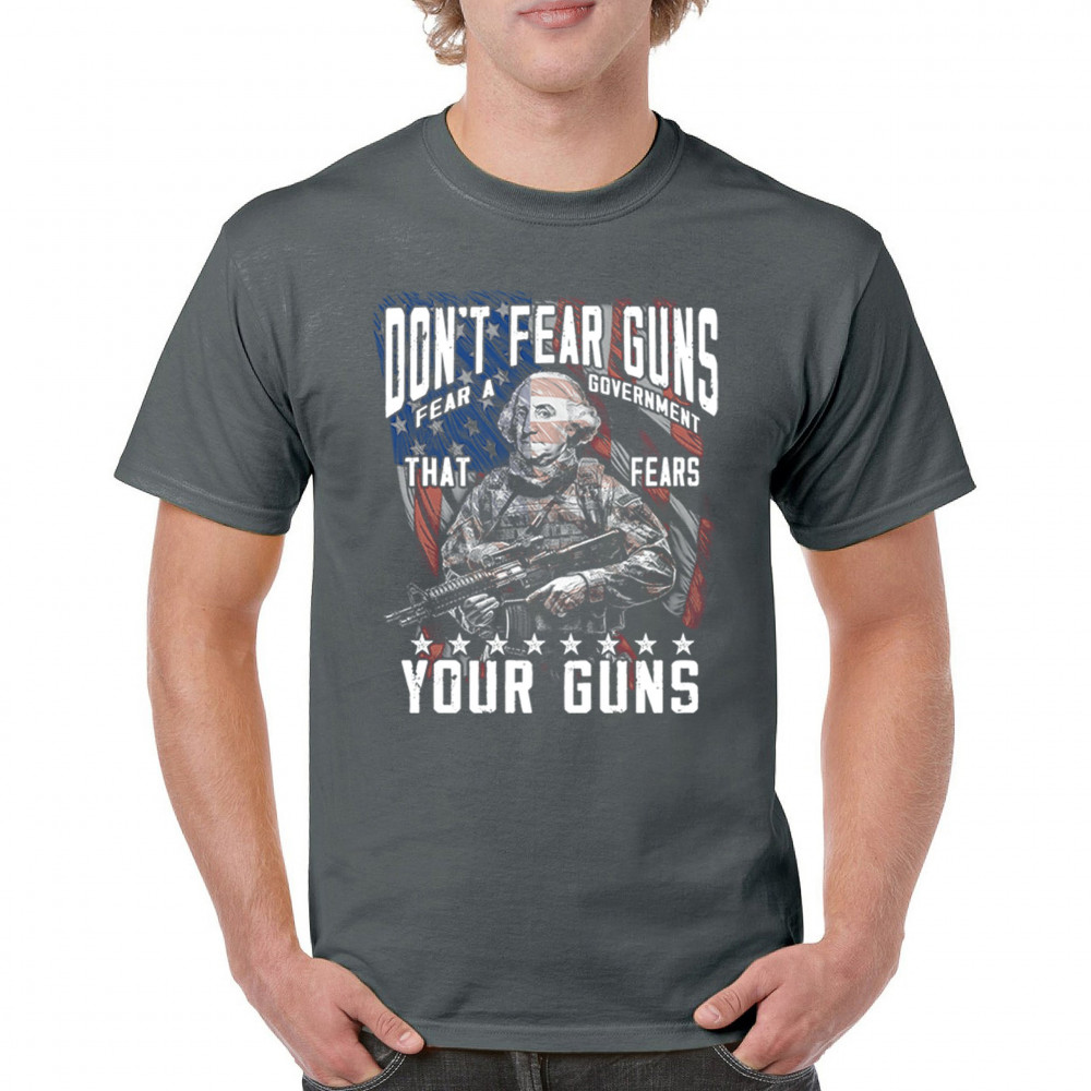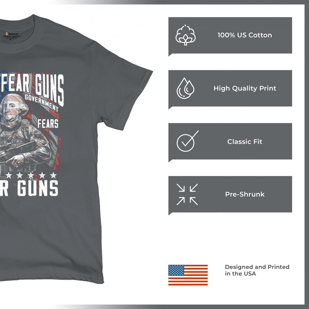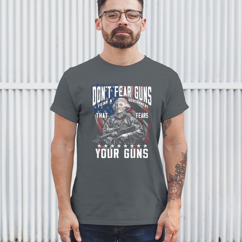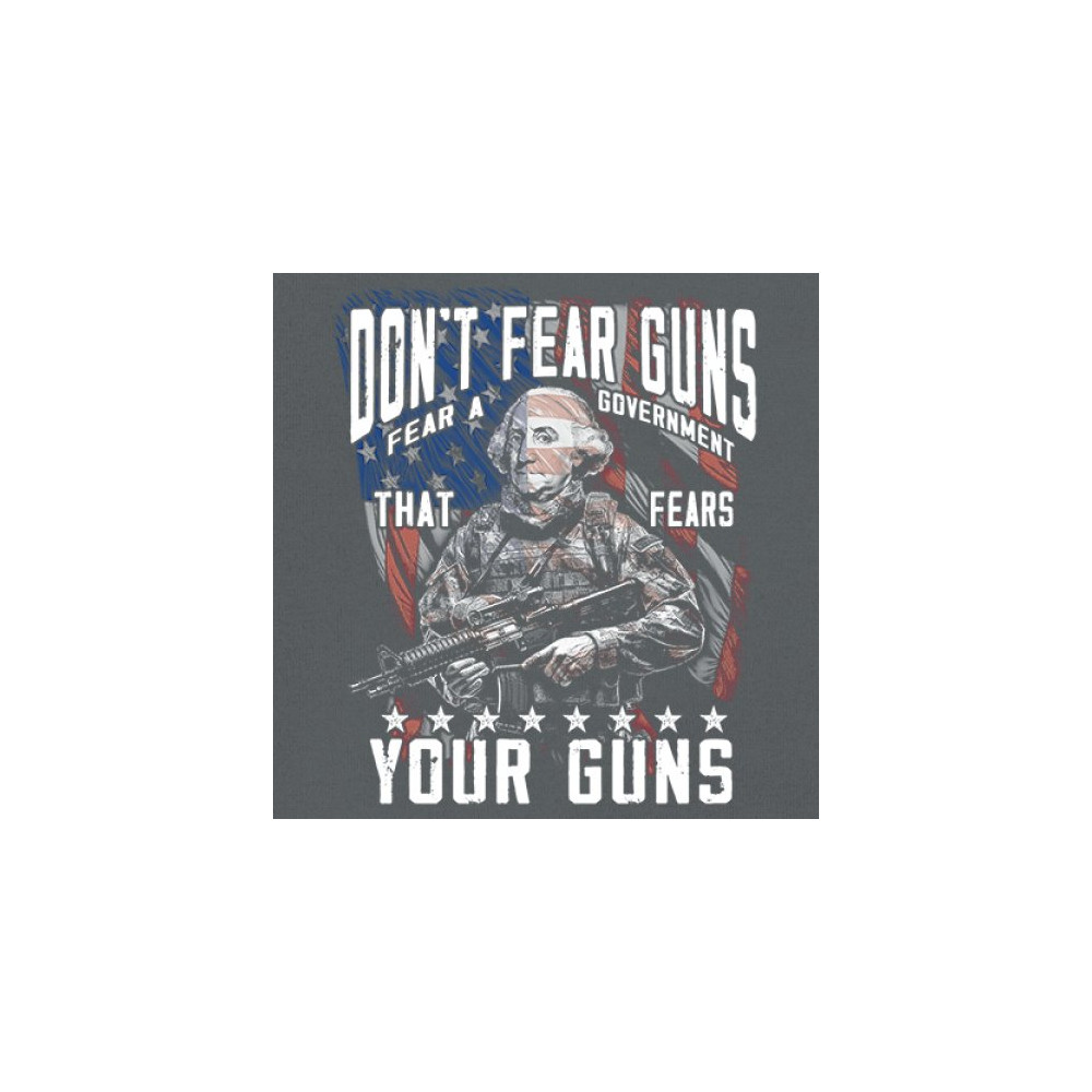 A fierce tribute to liberty, this design shows George Washington armed in tactical gear with the message "Don't Fear Guns, Fear a Government That Fears Your Guns." Perfect for 2nd Amendment patriots, protestors, and anyone who believes in self-defense and personal freedom. A bold, graphic statement for gun rights and political awareness.