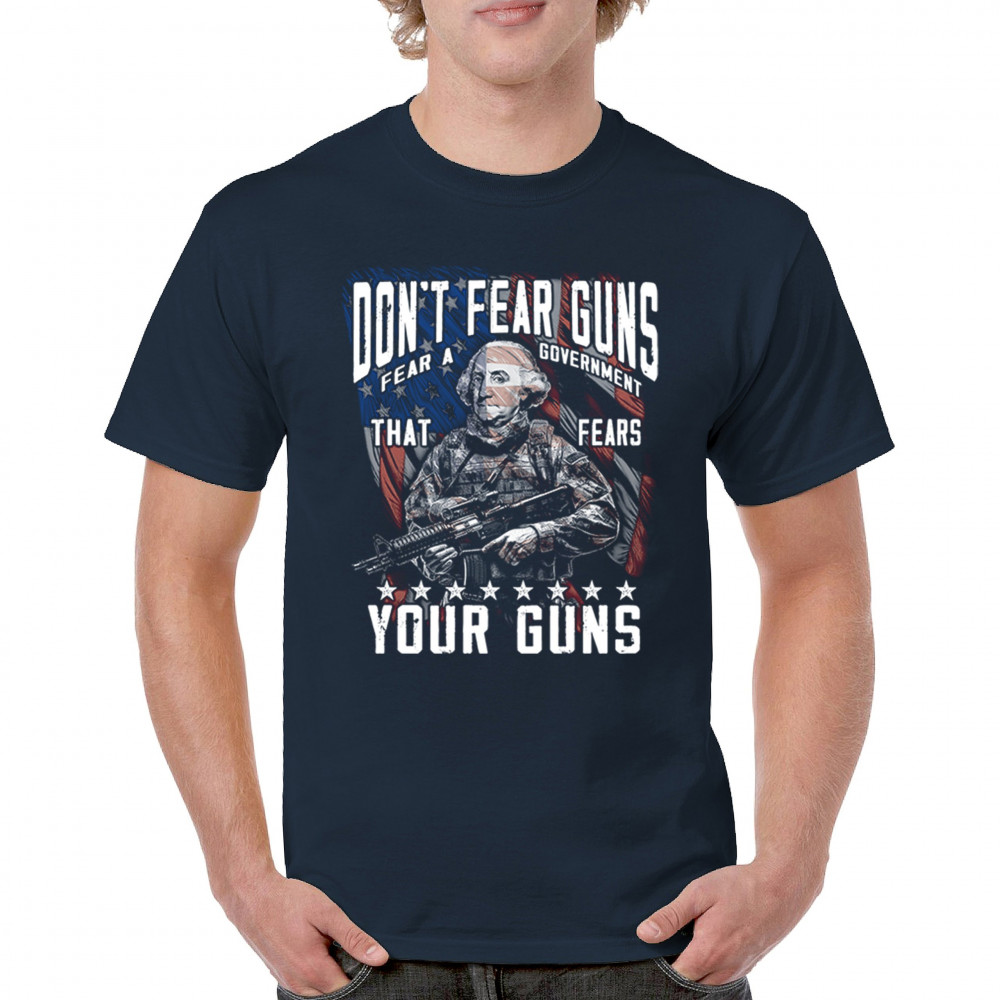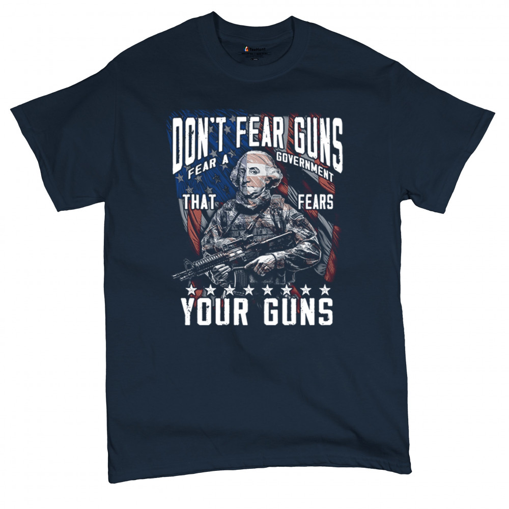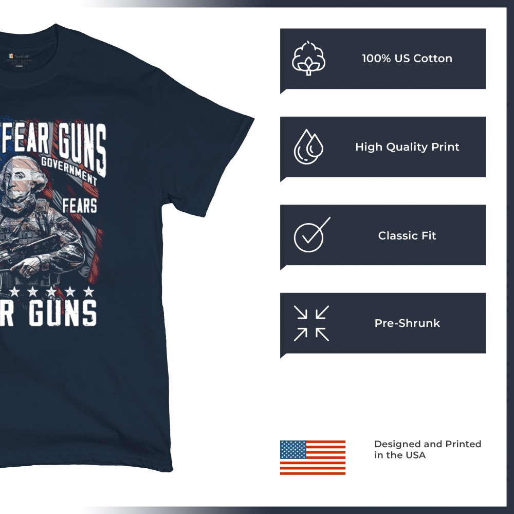 A fierce tribute to liberty, this design shows George Washington armed in tactical gear with the message "Don't Fear Guns, Fear a Government That Fears Your Guns." Perfect for 2nd Amendment patriots, protestors, and anyone who believes in self-defense and personal freedom. A bold, graphic statement for gun rights and political awareness.