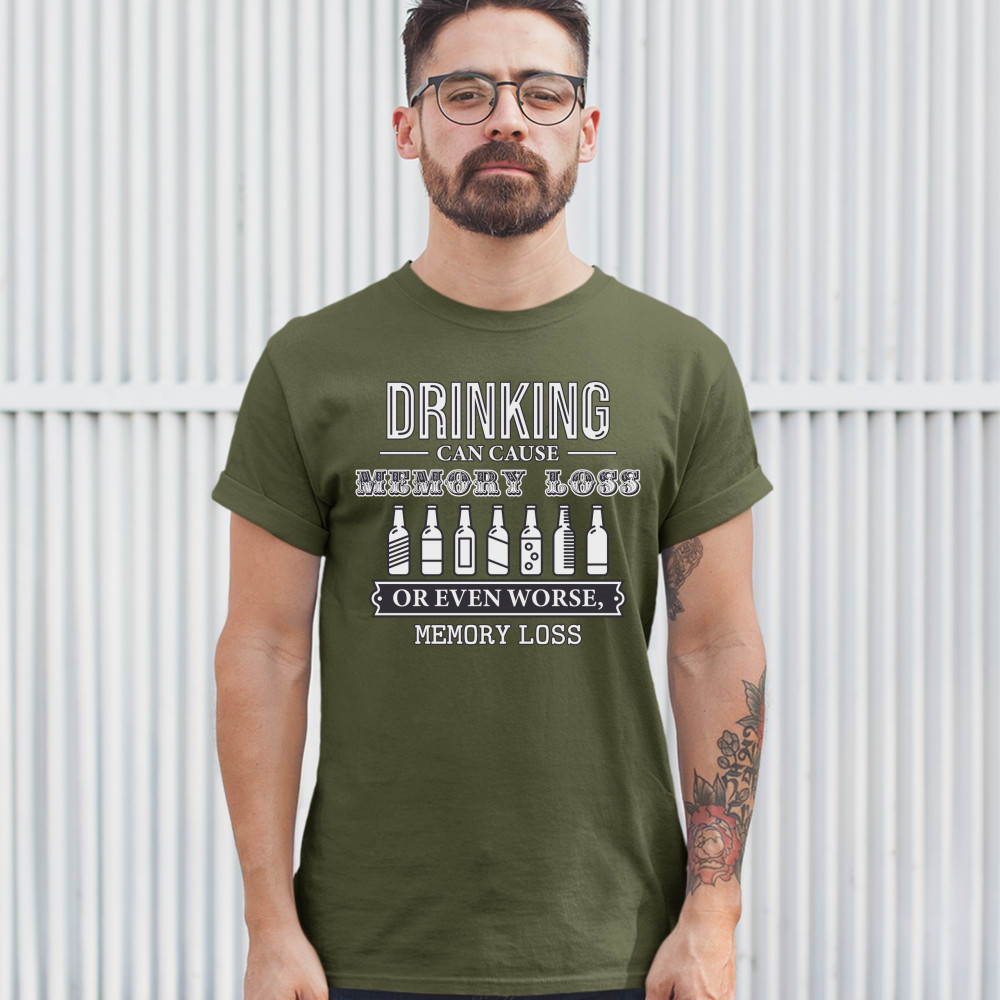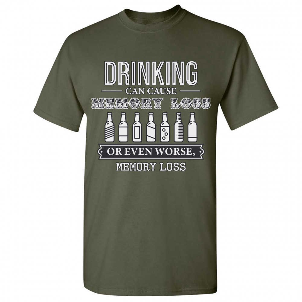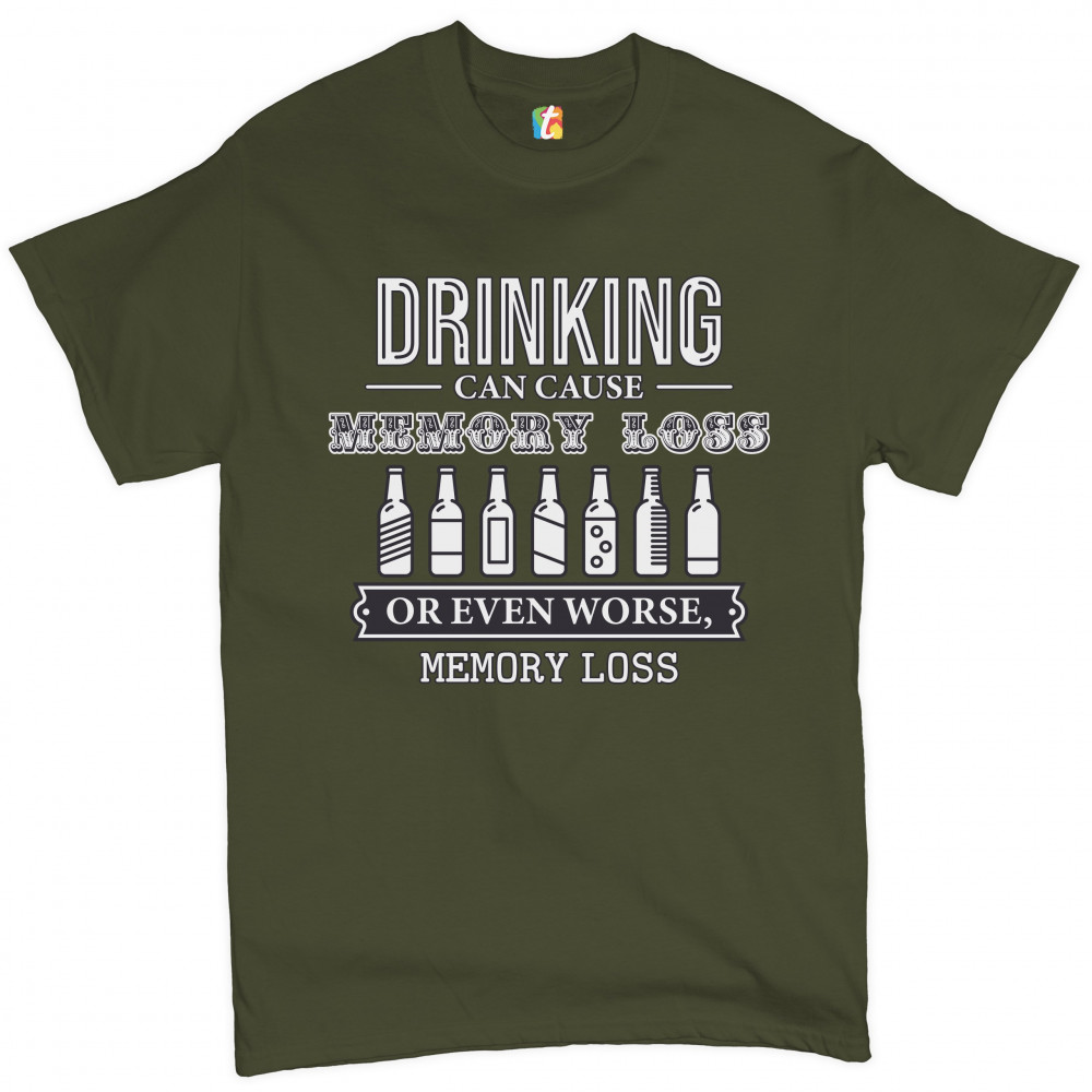 DRINKING CAN CAUSE MEMORY LOSS t-shirt alcohol beer inappropriate men's tee military green