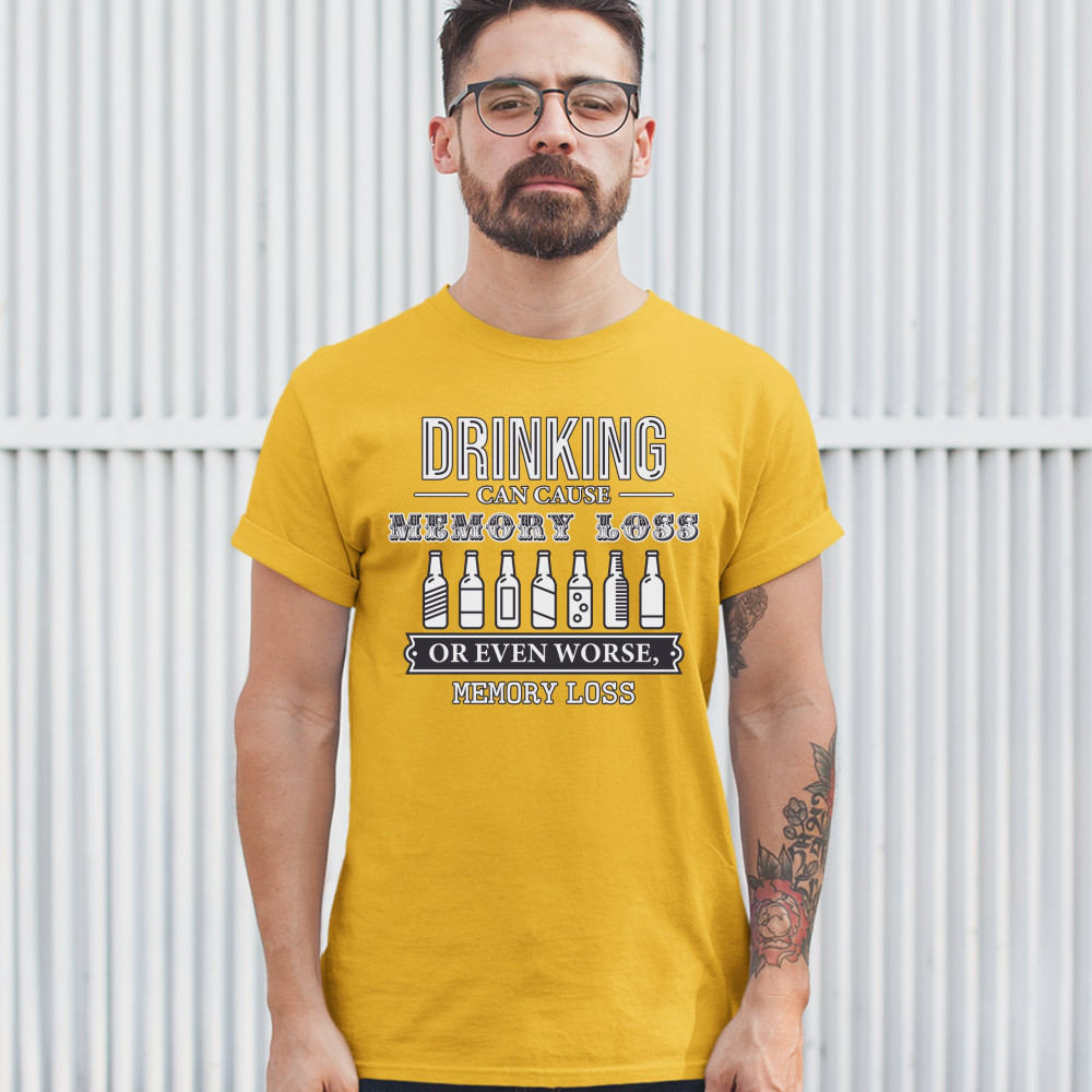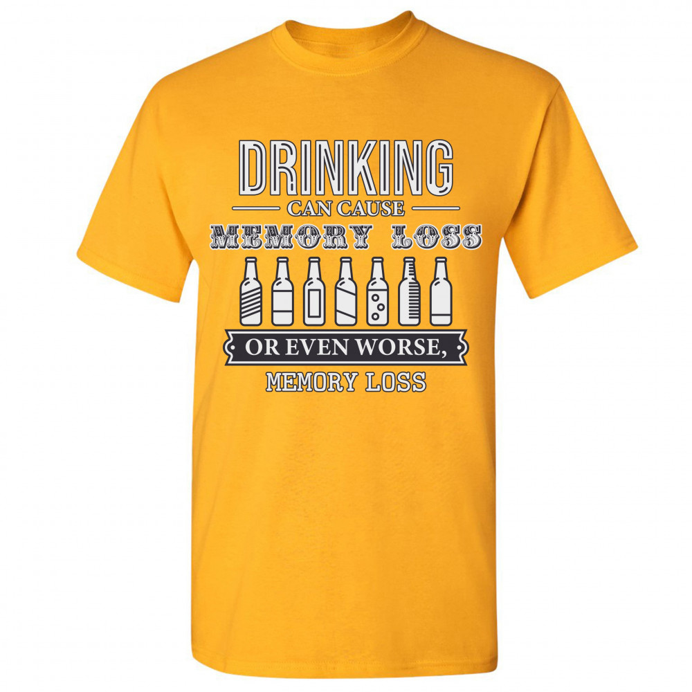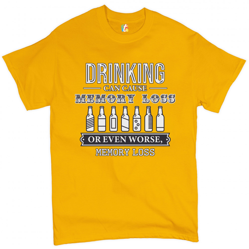 DRINKING CAN CAUSE MEMORY LOSS t-shirt alcohol beer inappropriate men's tee yellow
