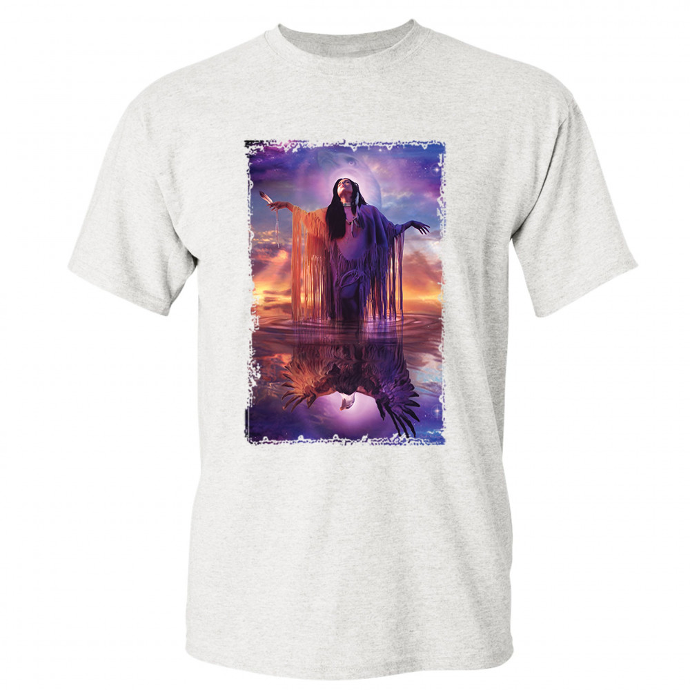 A print depicting a Native American woman standing in water with her hands spread. Instead of her reflection in the water an eagle with spread wings can be seen. A great gift for any person of the Native American background.