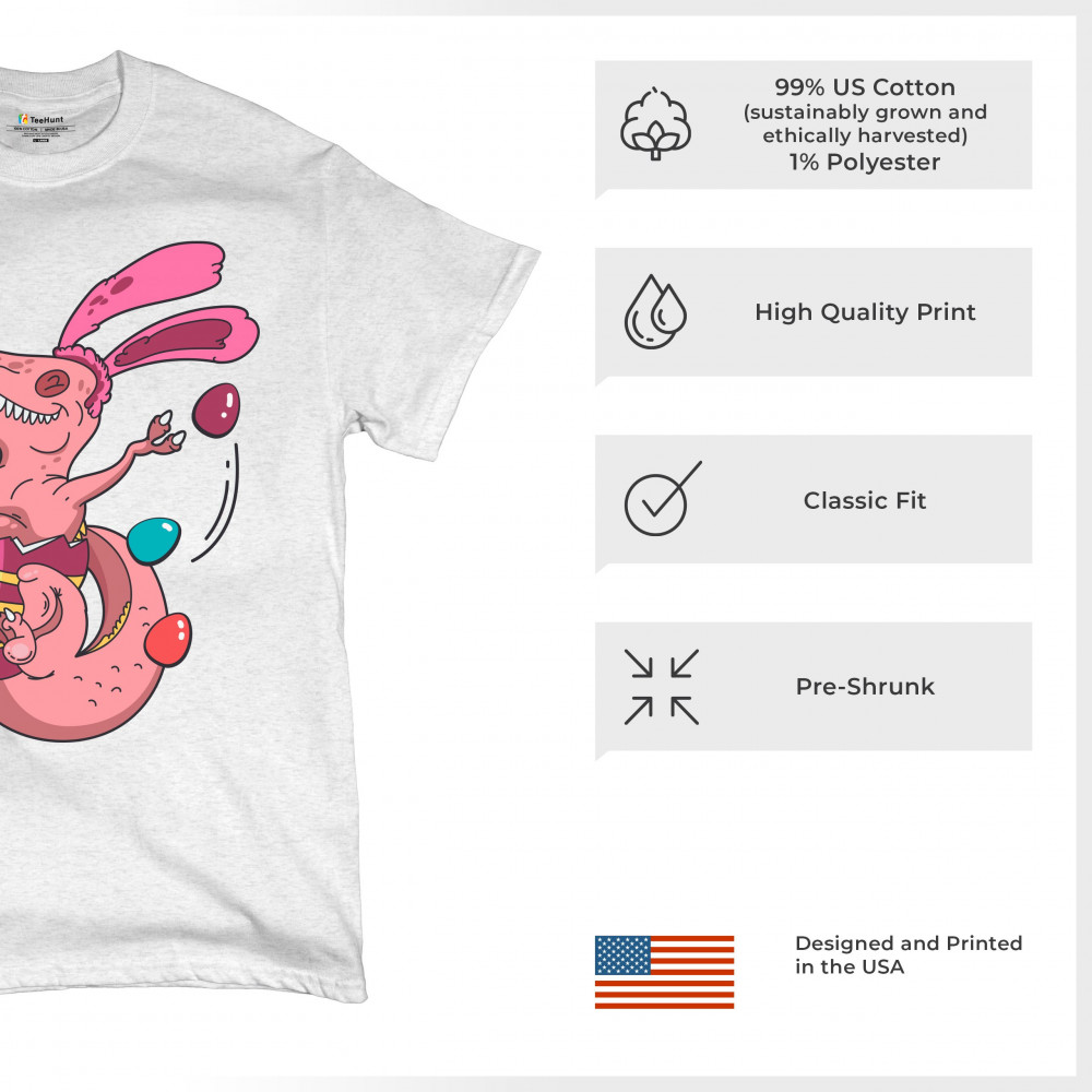 A print displaying a pink Tyrannosaurus Rex with rabbit ears hatching from an Easter egg surrounded by smaller eggs. A great gift for a religious person for Easter, Christmas or any other religious holiday.