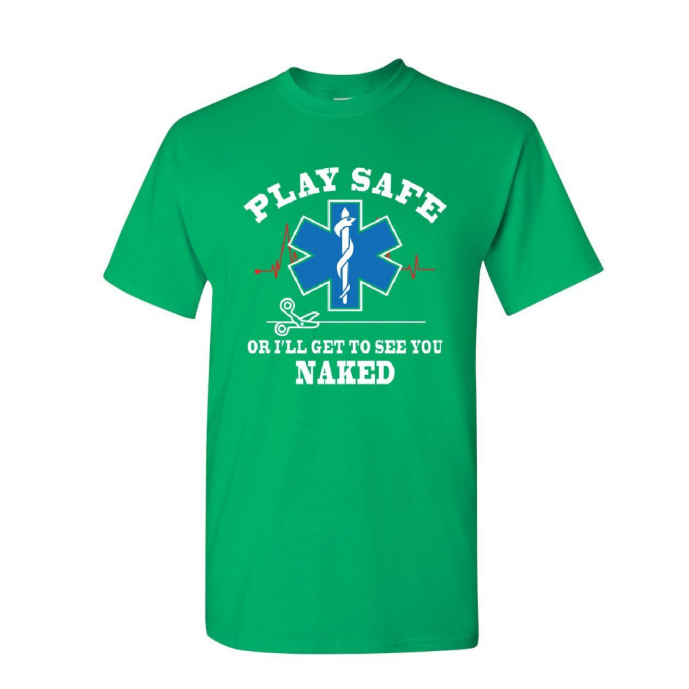 EMS PLAY SAFE OR I'LL GET TO SEE YOU NAKED t-shirt paramedic mens tee shirt green