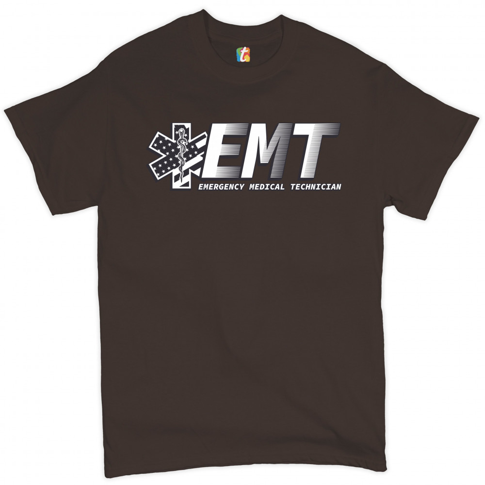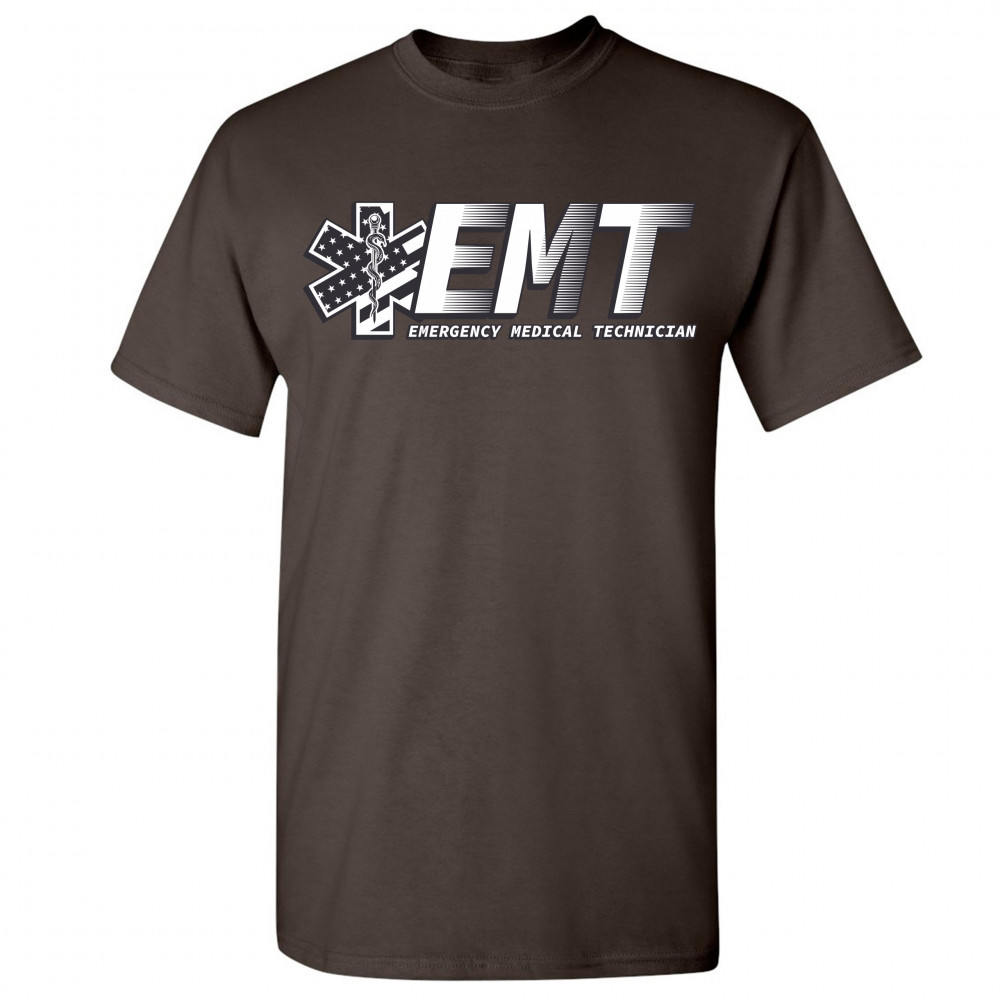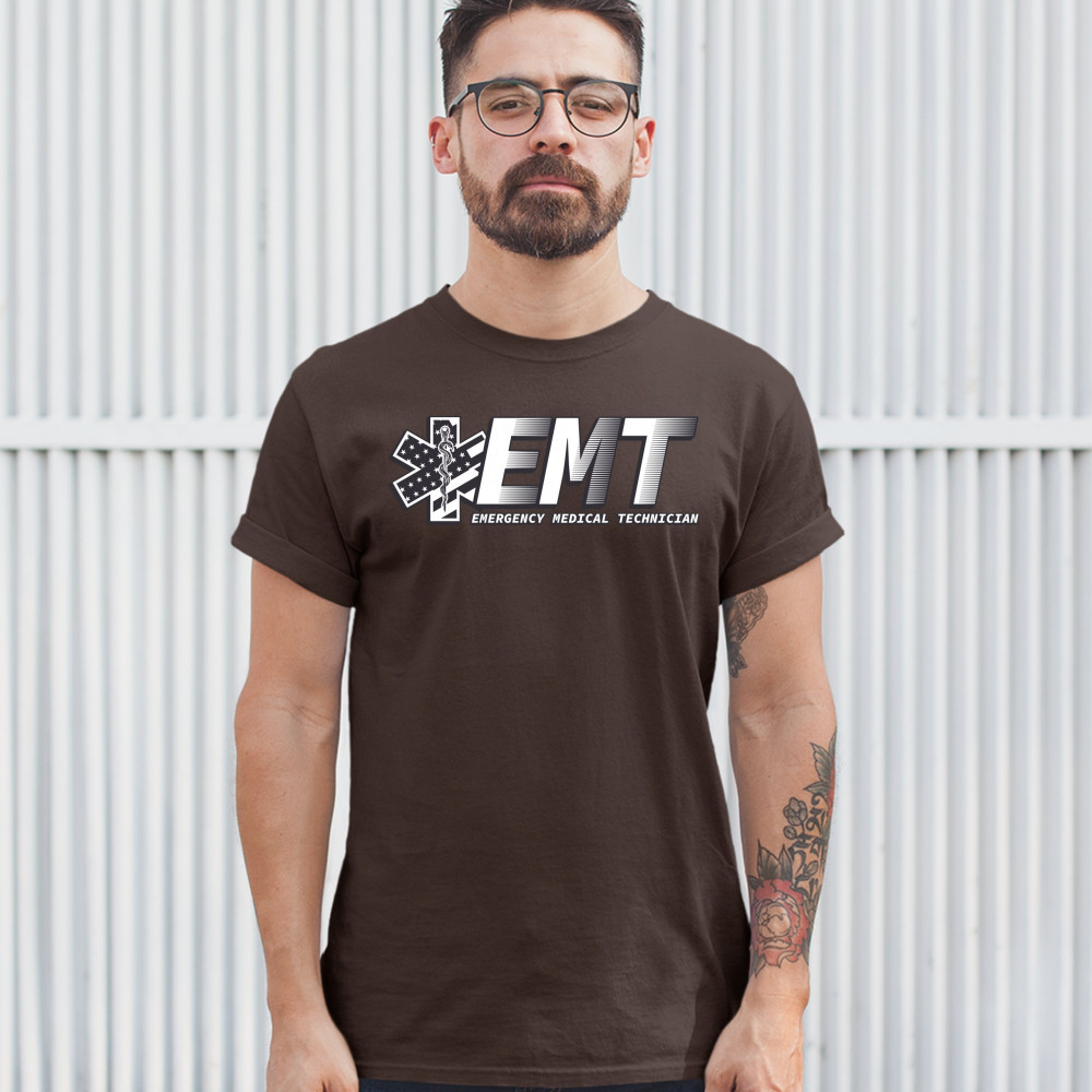 A print featuring big letters "EMT" - an abbreviation for "Emergency Medical Technician". On the left side the print features a Star of Life, the worldwide recognized symbol of emergency medical services, with the Rod of Asclepius and Stars and Stripes in