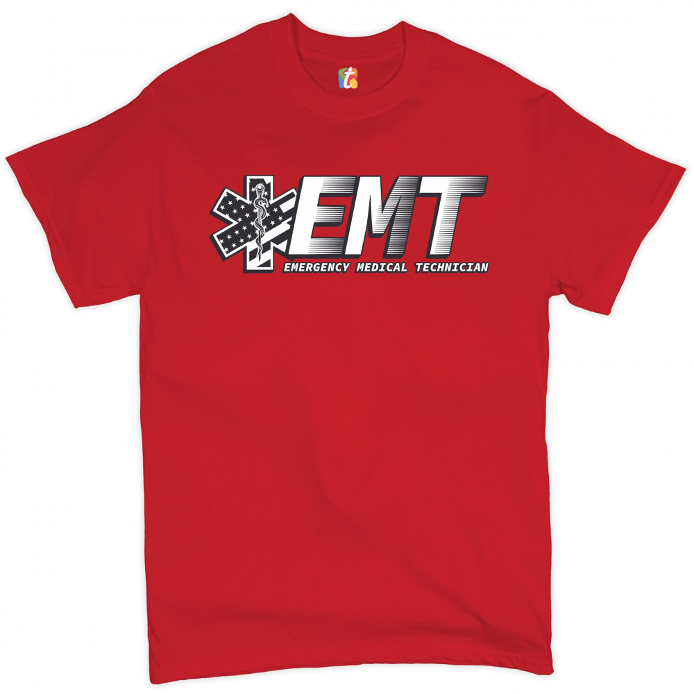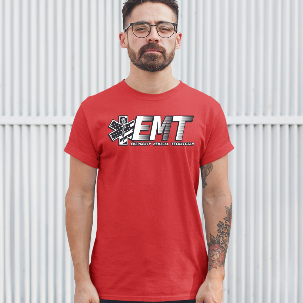A print featuring big letters "EMT" - an abbreviation for "Emergency Medical Technician". On the left side the print features a Star of Life, the worldwide recognized symbol of emergency medical services, with the Rod of Asclepius and Stars and Stripes in