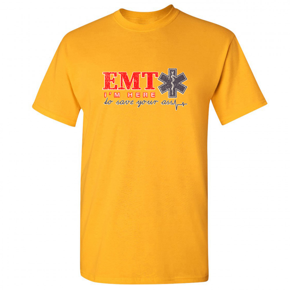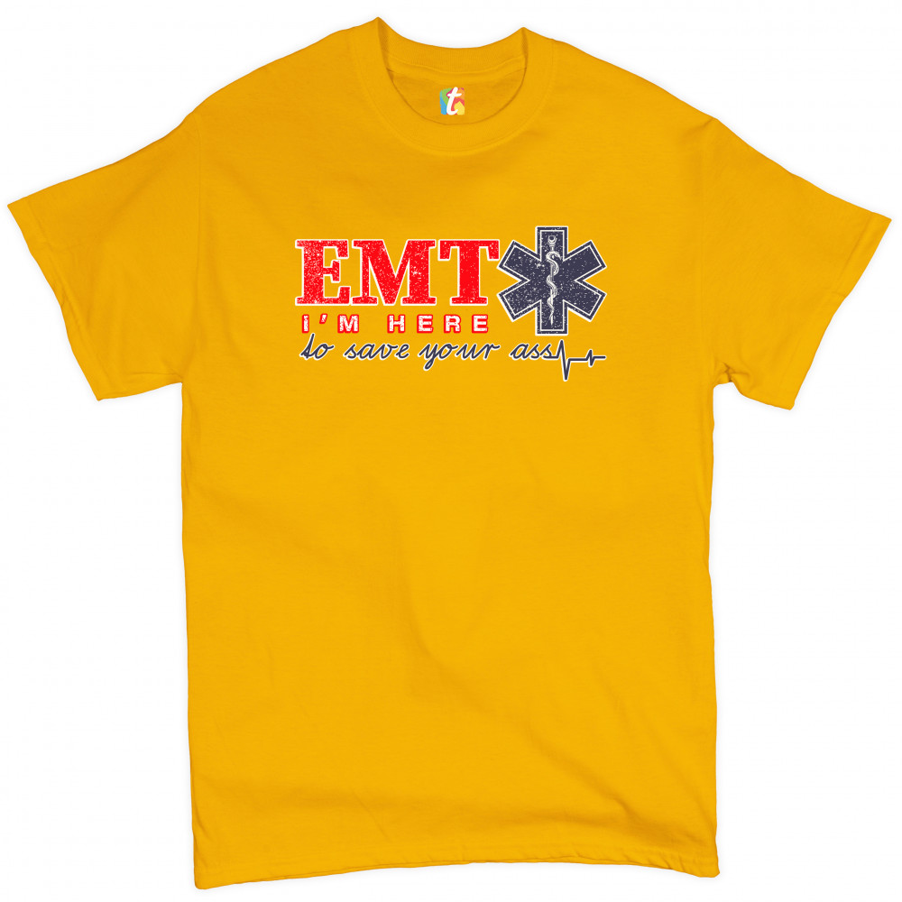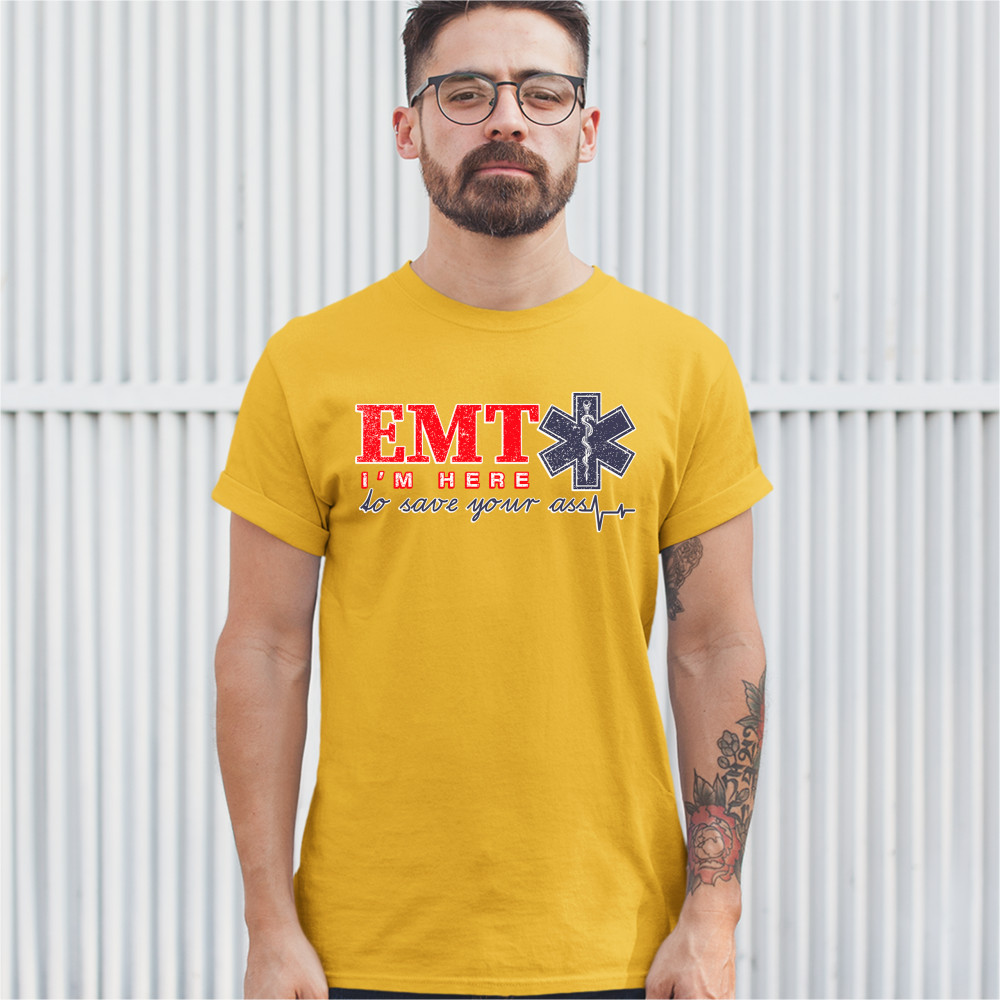 A funny print saying "EMT I'm Here to Save Your Ass". To the right of "EMT" there is the Star of Life, the worldwide recognized symbol of emergency medical services, with the Rod of Asclepius inside of it. A great choice as a gift for a first responder.