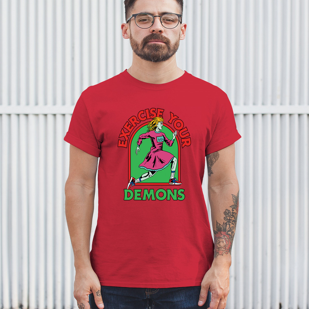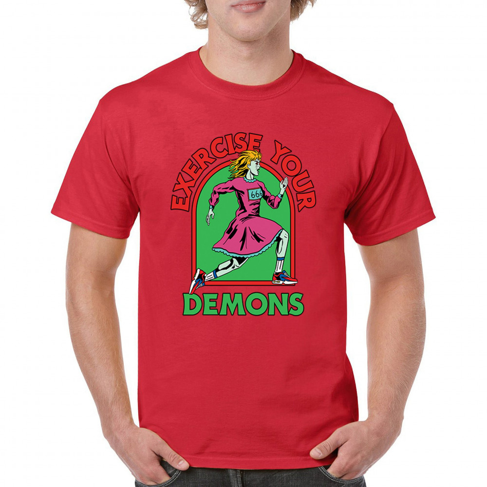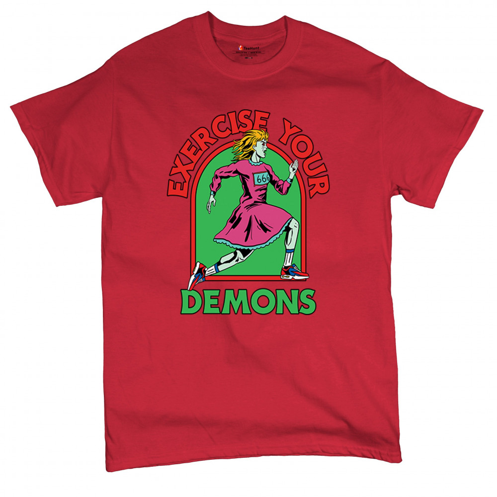 Exercise Your Demons shirt – funny halloween gym shirt with fitness humor, scary workout design, demon runner style, and spooky parody vibes.