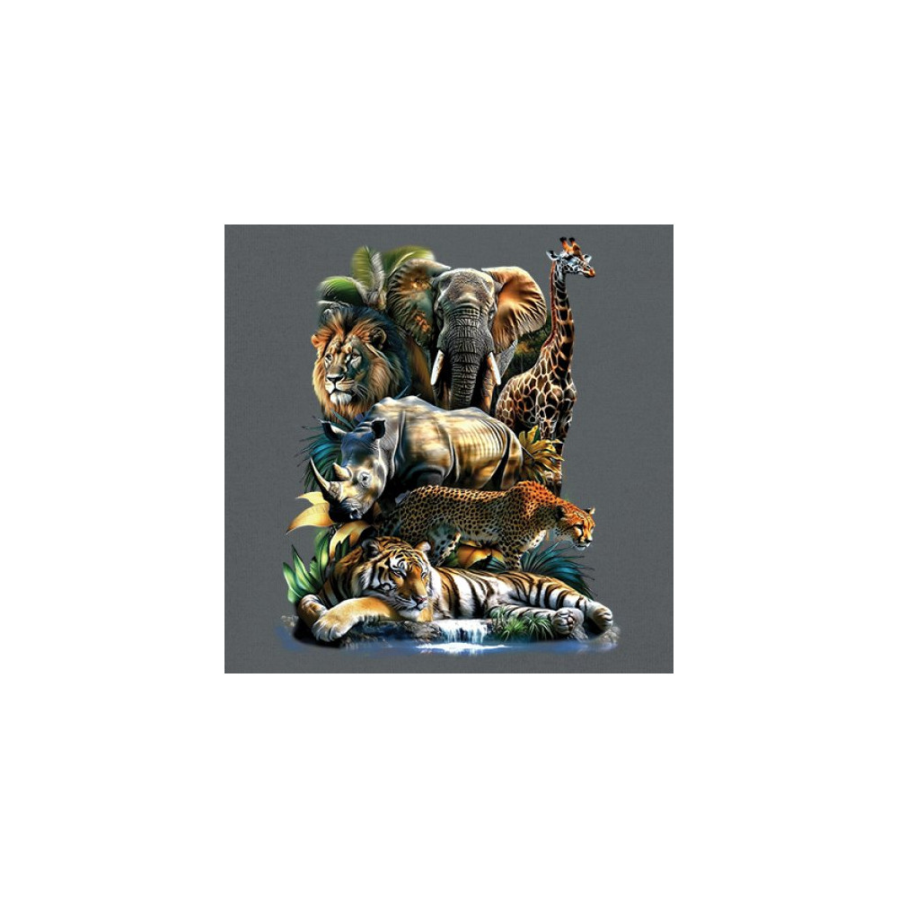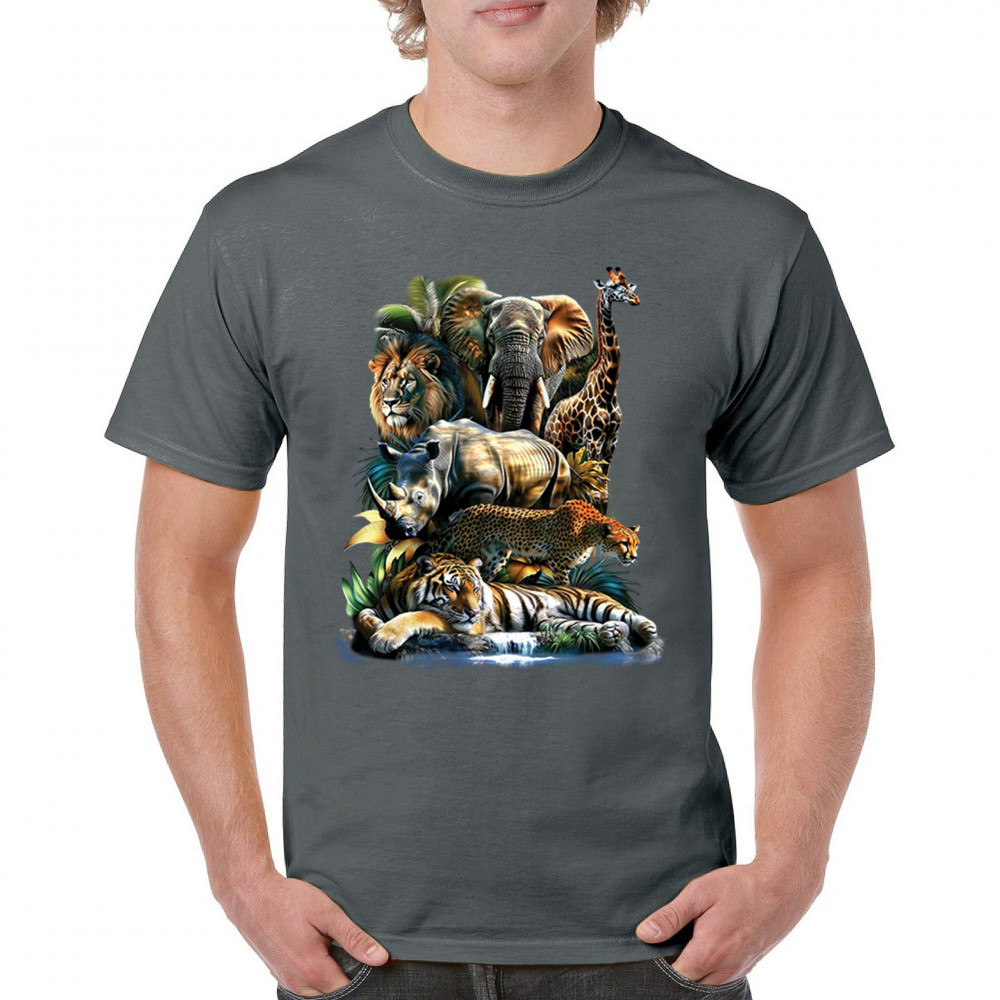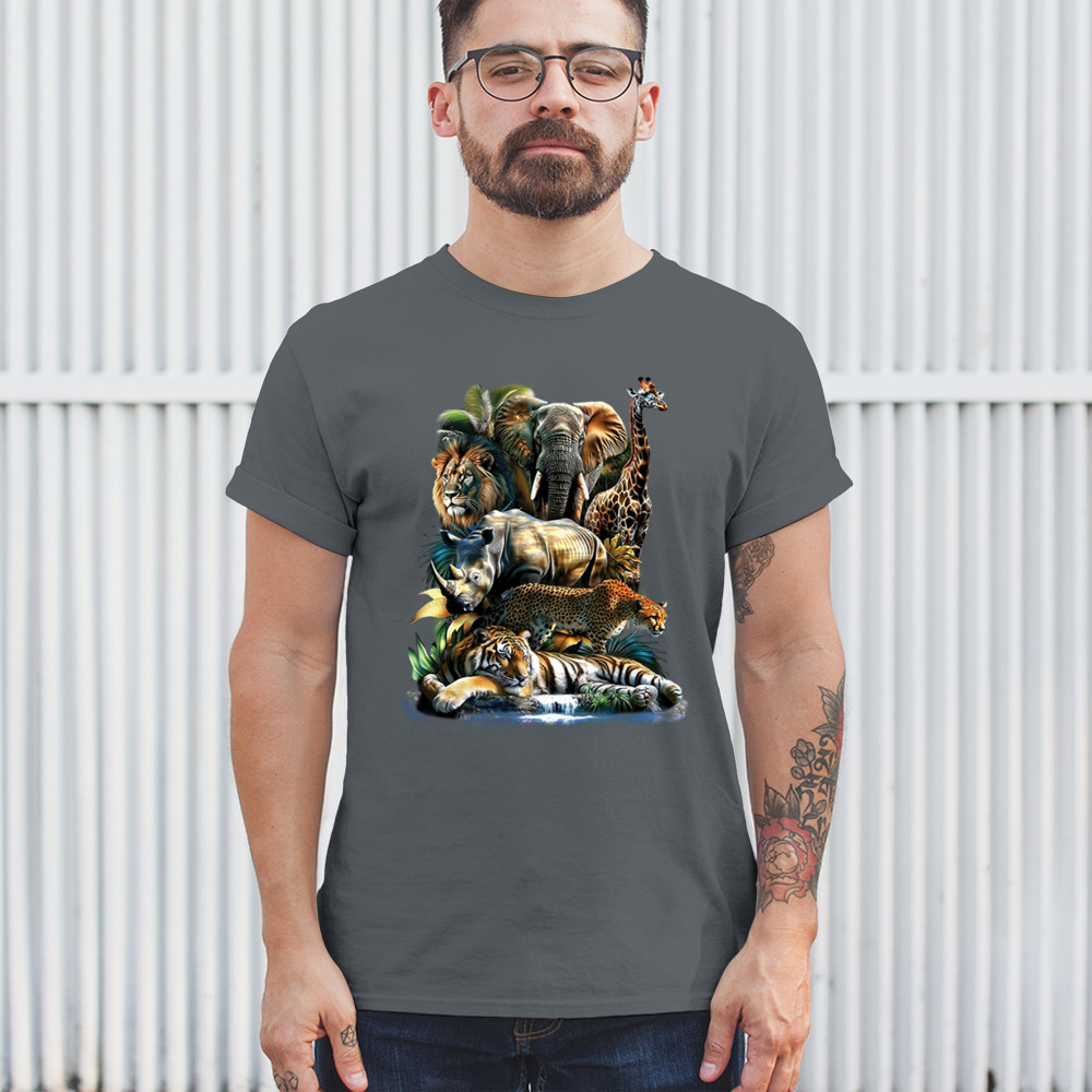 Wildlife design with lion, tiger, giraffe, rhino, cheetah, and elephant. Perfect for animal lovers and safari fans who embrace nature’s fierce spirit.