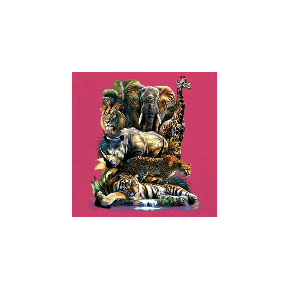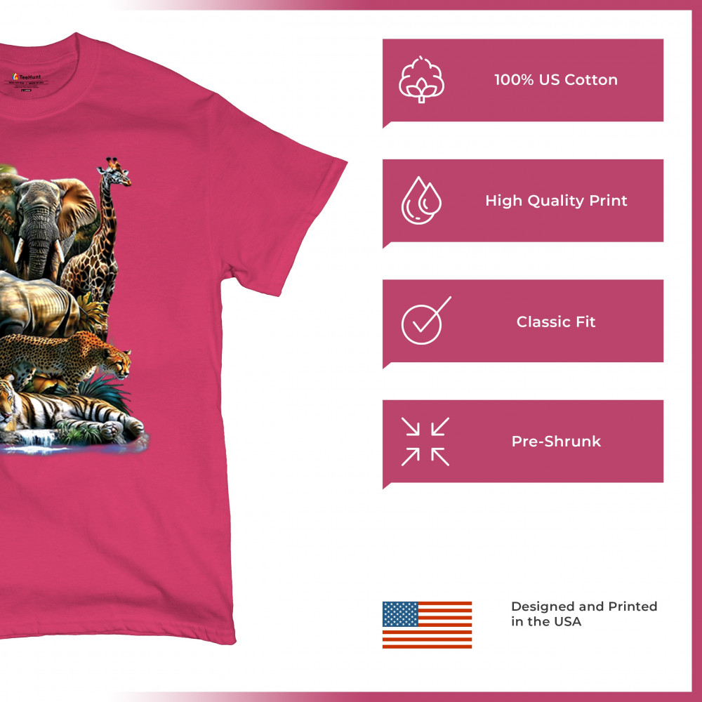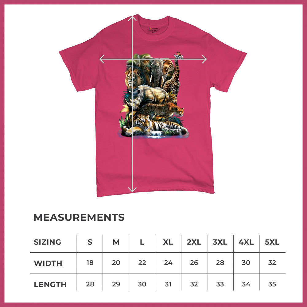 Wildlife design with lion, tiger, giraffe, rhino, cheetah, and elephant. Perfect for animal lovers and safari fans who embrace nature’s fierce spirit.
