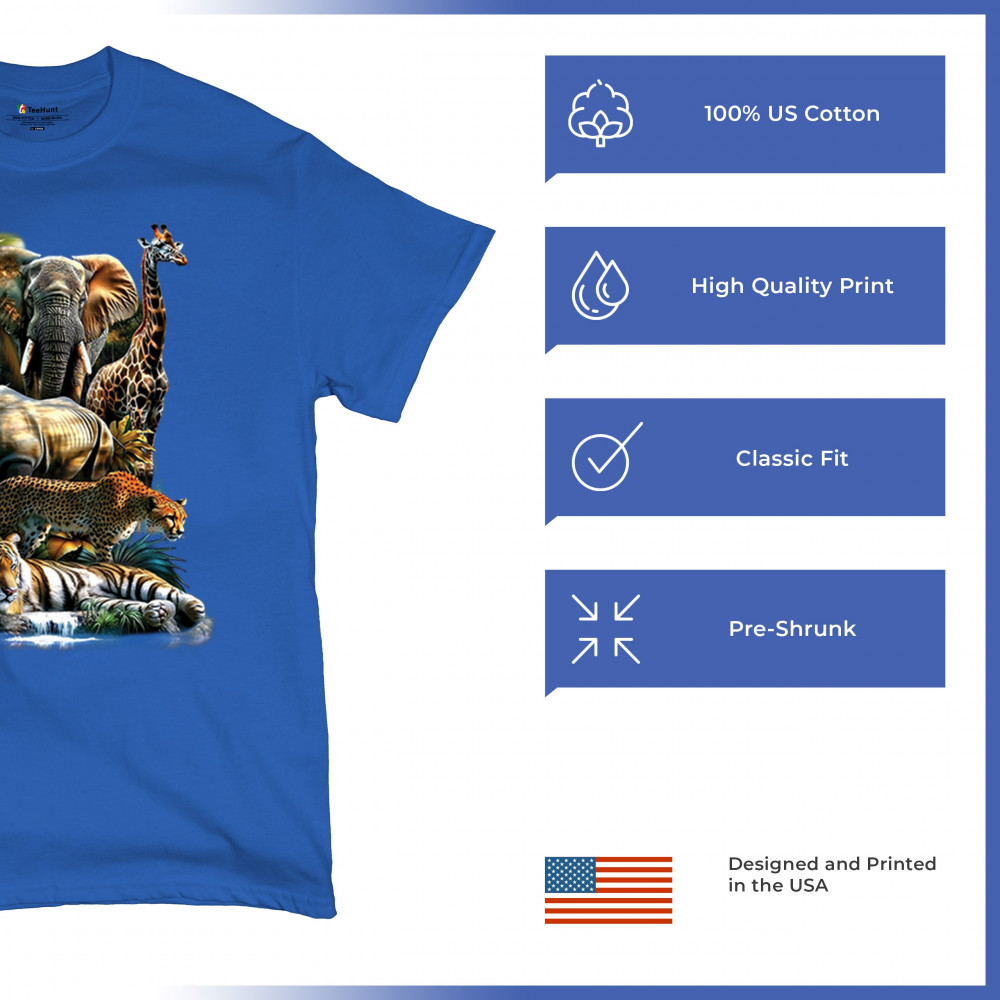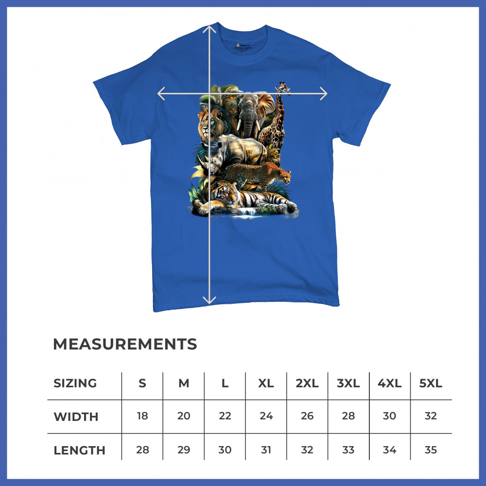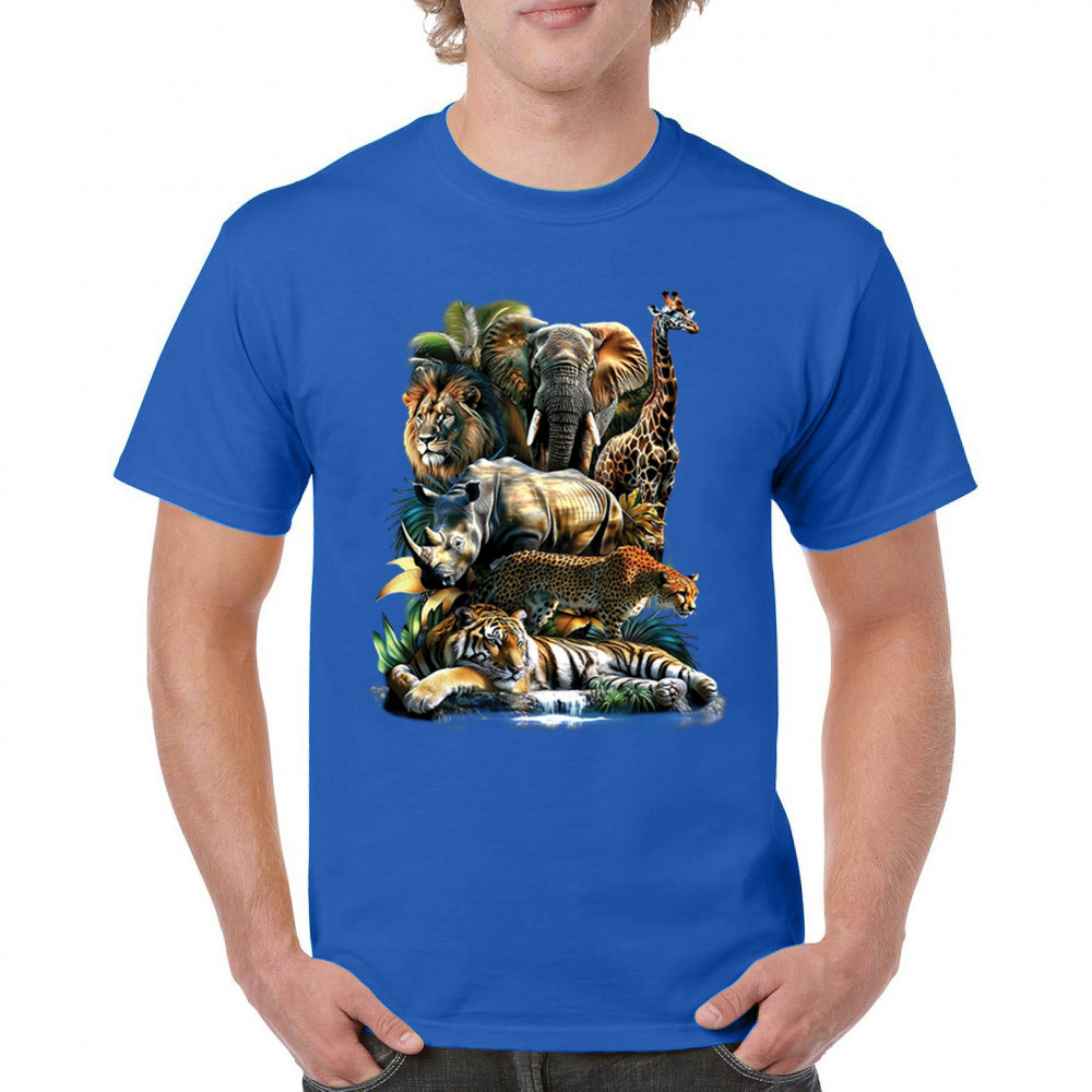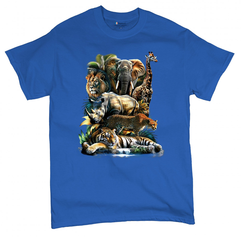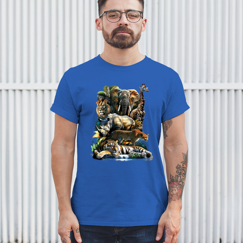 Wildlife design with lion, tiger, giraffe, rhino, cheetah, and elephant. Perfect for animal lovers and safari fans who embrace nature’s fierce spirit.