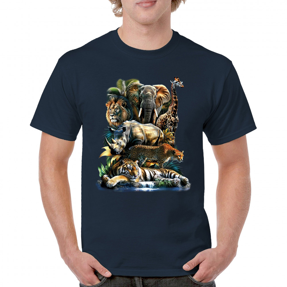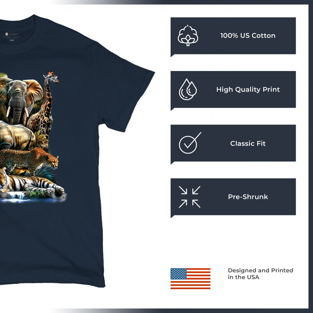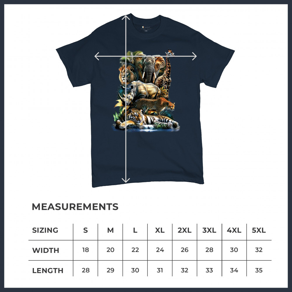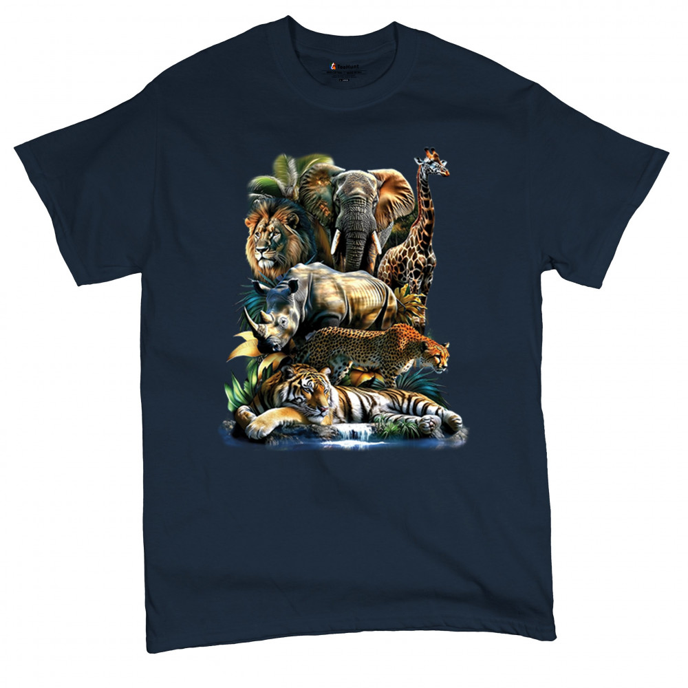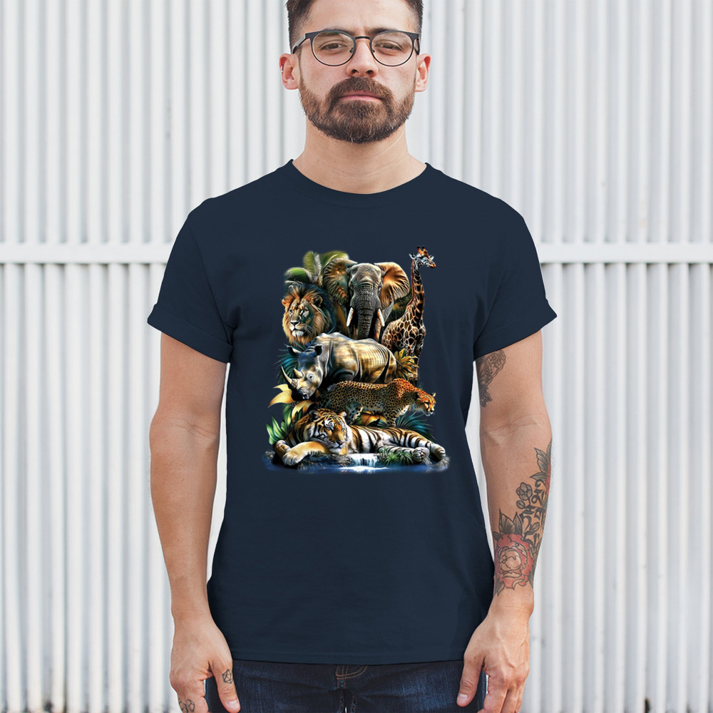 Wildlife design with lion, tiger, giraffe, rhino, cheetah, and elephant. Perfect for animal lovers and safari fans who embrace nature’s fierce spirit.
