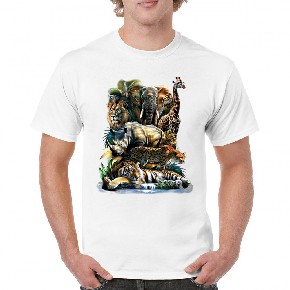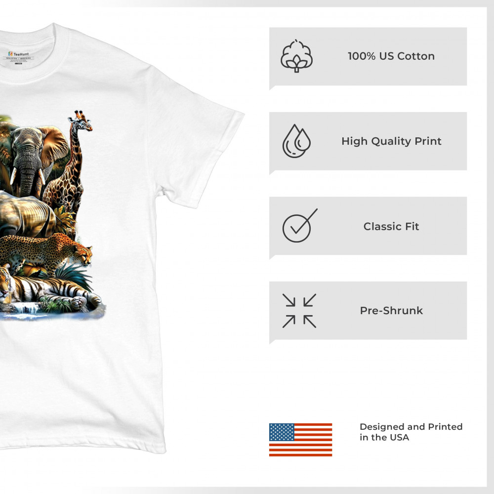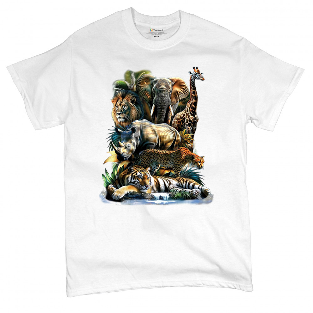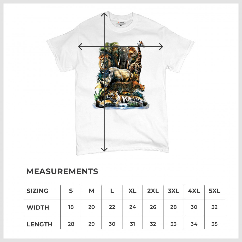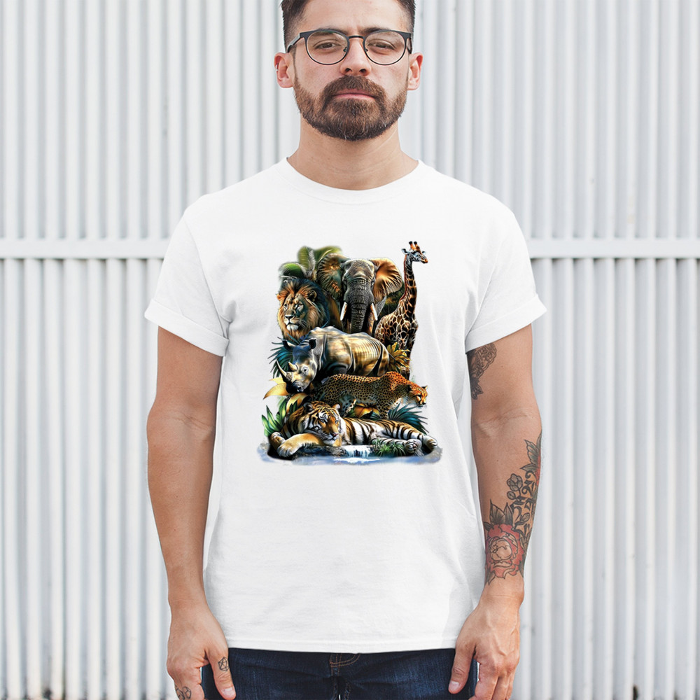 Wildlife design with lion, tiger, giraffe, rhino, cheetah, and elephant. Perfect for animal lovers and safari fans who embrace nature’s fierce spirit.