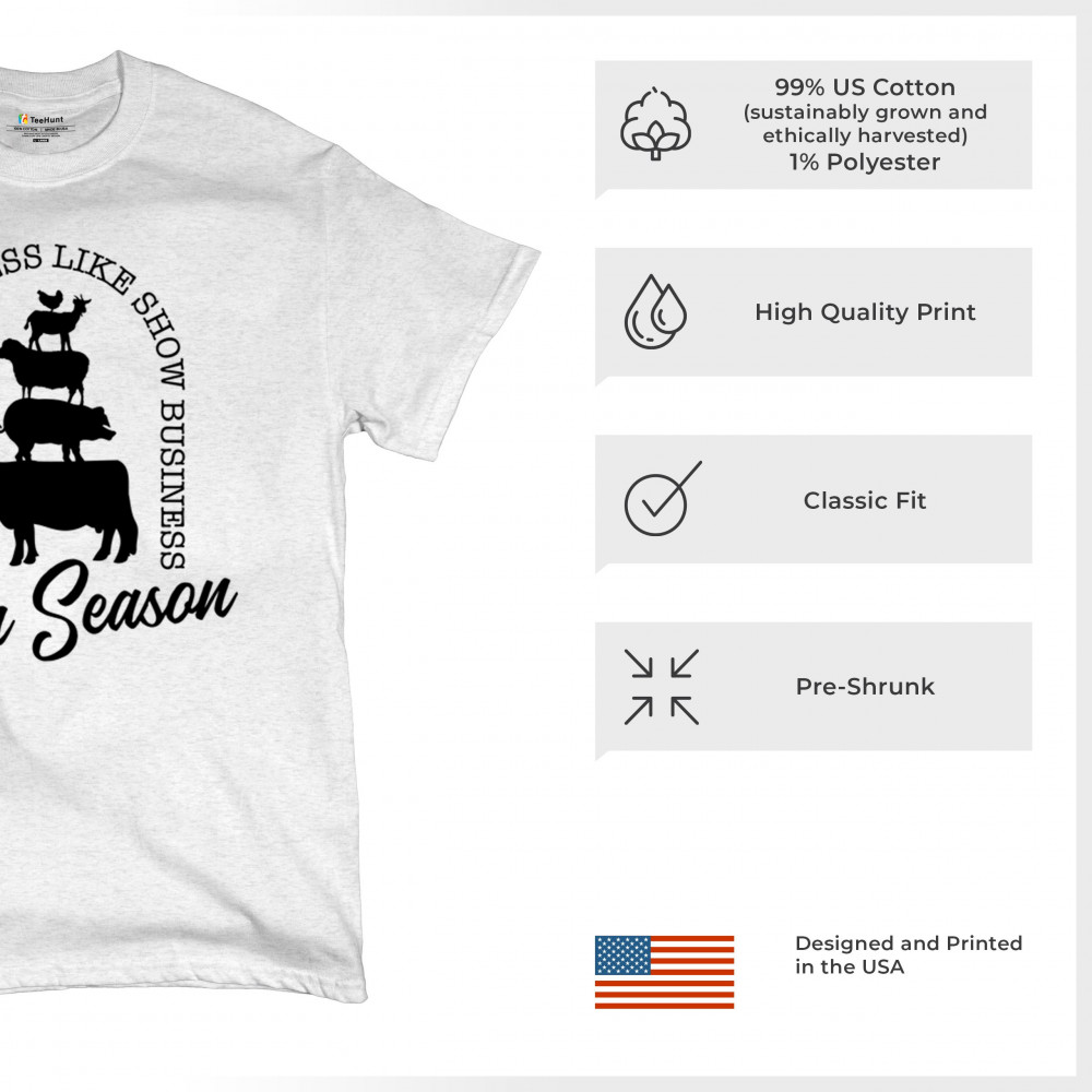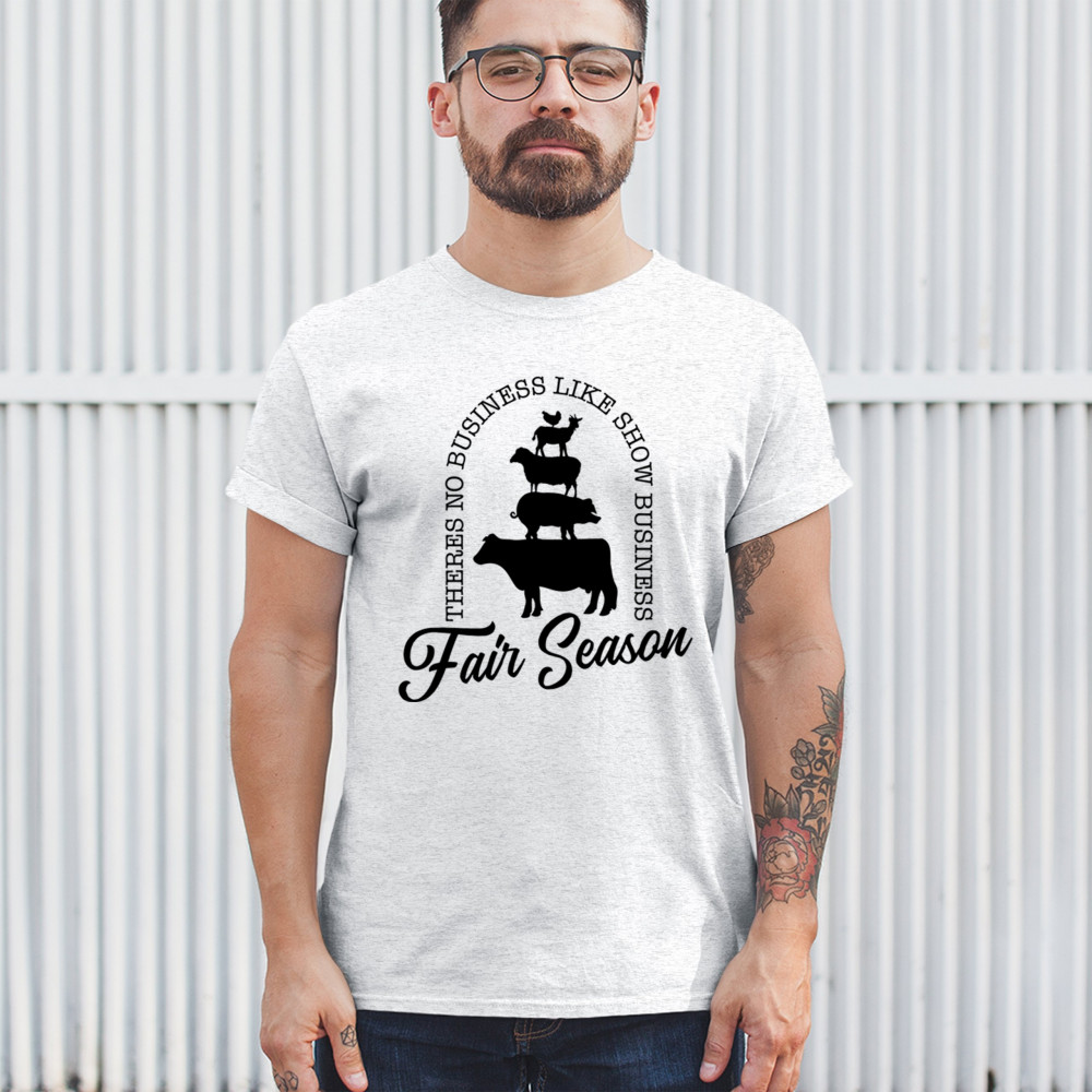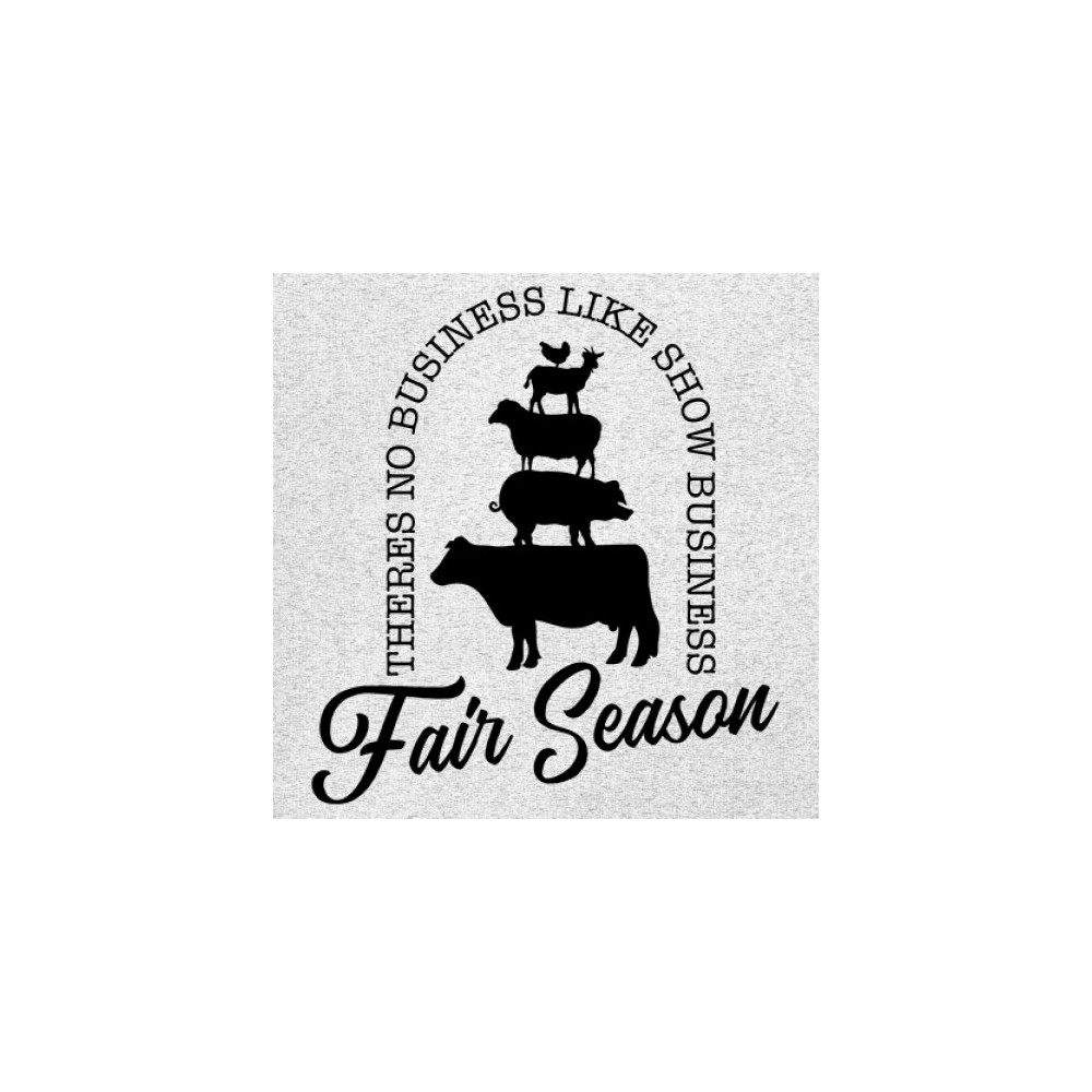Embrace the spirit of fair season with our "Fair Season" design, ideal for anyone who loves farm animals and the excitement of fairs. Featuring silhouettes of a chicken, goat, sheep, and cow stacked together, this design brings a touch of whimsy and fun to any occasion. Perfect for 4-H members, farmers, and fair enthusiasts, it's a great way to express your love for agricultural fairs and farm life. This design makes an excellent gift, capturing the essence of show business and the joy of the fair season.
