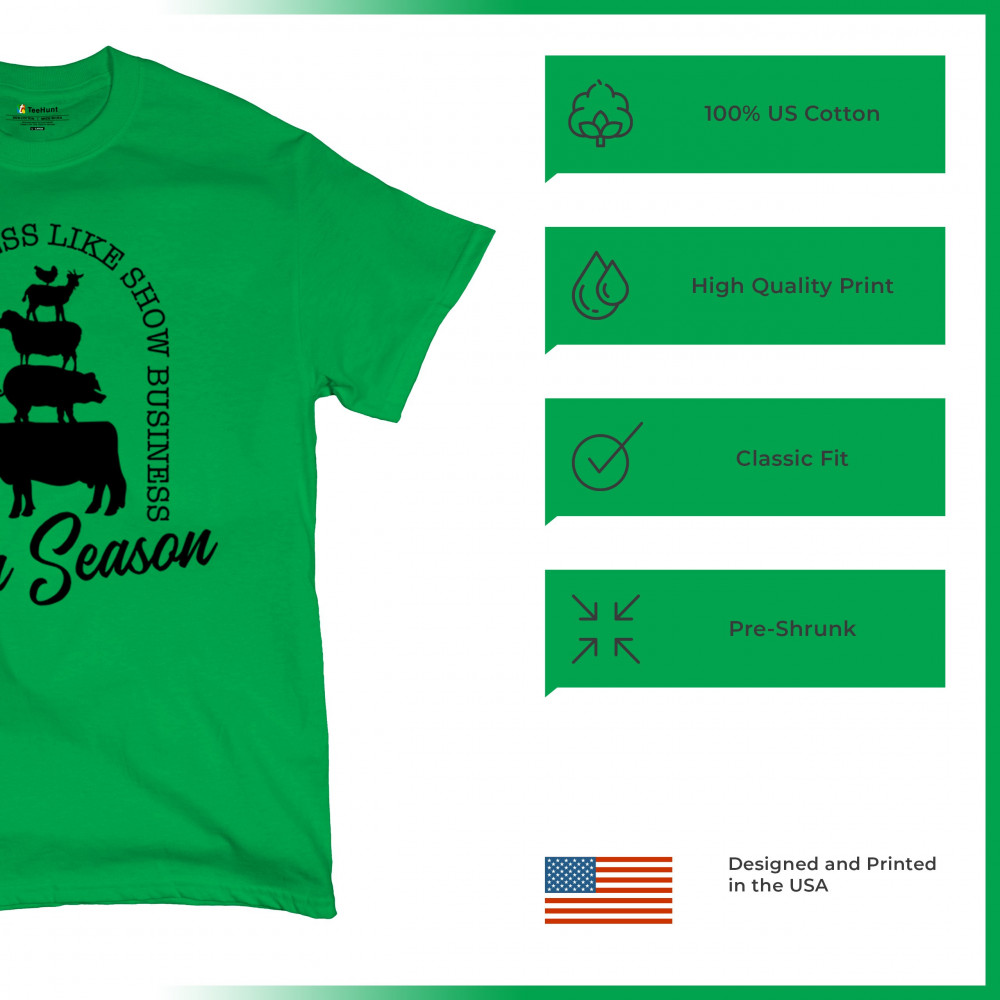 Embrace the spirit of fair season with our "Fair Season" design, ideal for anyone who loves farm animals and the excitement of fairs. Featuring silhouettes of a chicken, goat, sheep, and cow stacked together, this design brings a touch of whimsy and fun to any occasion. Perfect for 4-H members, farmers, and fair enthusiasts, it's a great way to express your love for agricultural fairs and farm life. This design makes an excellent gift, capturing the essence of show business and the joy of the fair season.