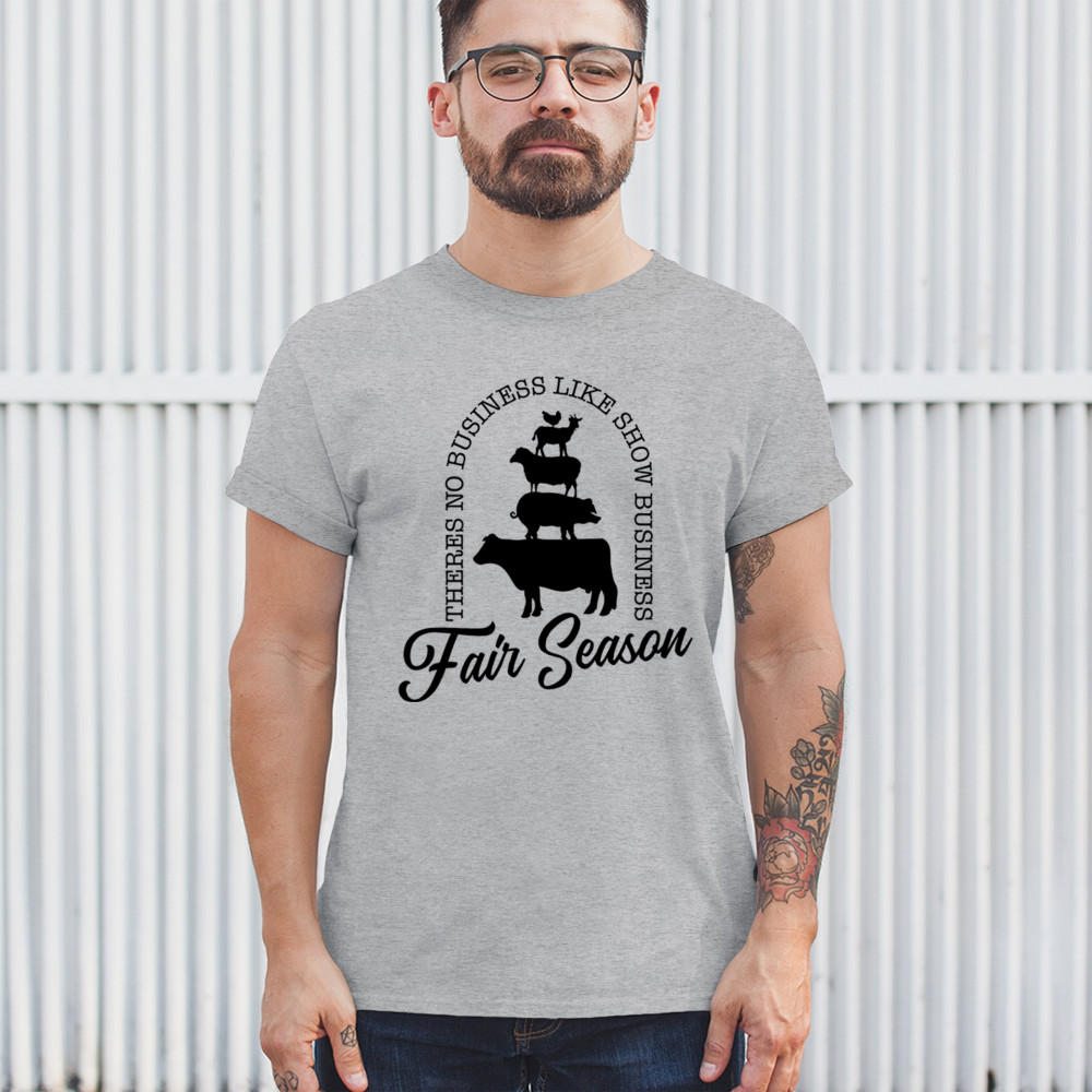 Embrace the spirit of fair season with our "Fair Season" design, ideal for anyone who loves farm animals and the excitement of fairs. Featuring silhouettes of a chicken, goat, sheep, and cow stacked together, this design brings a touch of whimsy and fun to any occasion. Perfect for 4-H members, farmers, and fair enthusiasts, it's a great way to express your love for agricultural fairs and farm life. This design makes an excellent gift, capturing the essence of show business and the joy of the fair season.