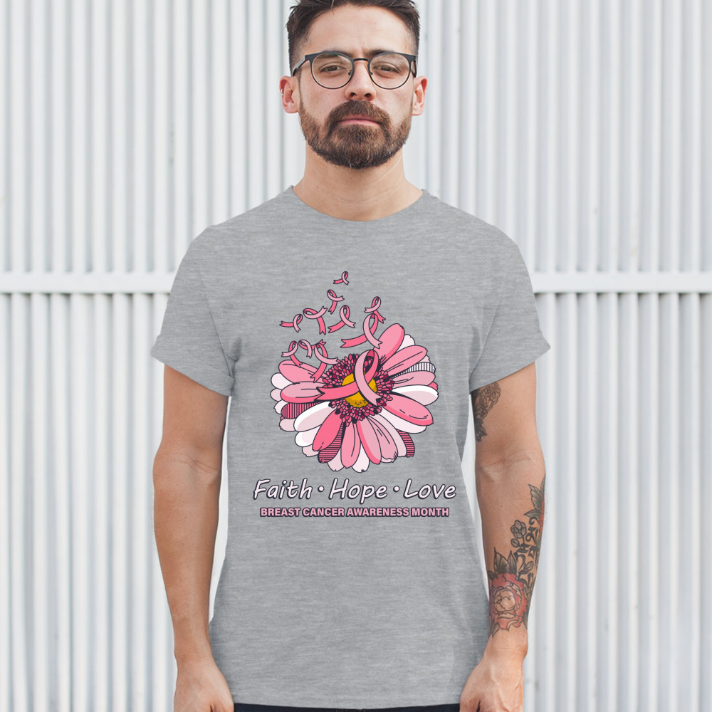 A print featuring a big flower with several petals missing and numerous pink ribbons flying away from it. The print says: "Faith Hope Love" and "Breast Cancer Awareness Month". Wear it to spread awareness abouth the disease and support a person you know w