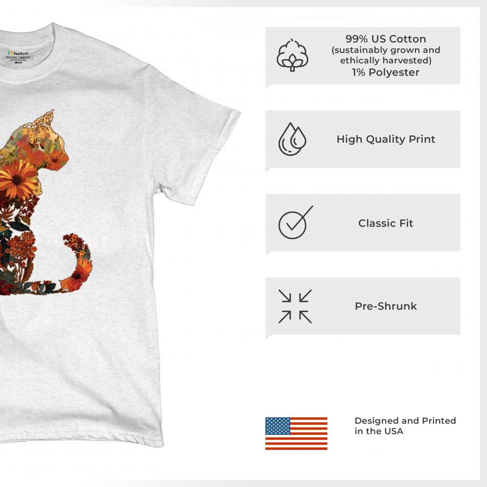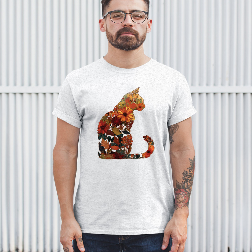 Bring autumn charm to your wardrobe with this cozy cat design filled with fall leaves and florals. Perfect for pet lovers, rustic farmhouse style, pumpkin patch outings, and fall festivals, it’s a unique way to showcase both your love of cats and seasonal harvest vibes.