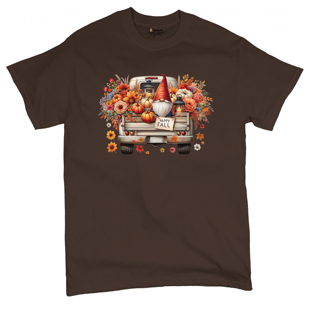 Rustic gnome truck design with pumpkins, wildflowers, and lantern glow. Perfect for Thanksgiving Day, farmhouse harvest, and cozy autumn style.