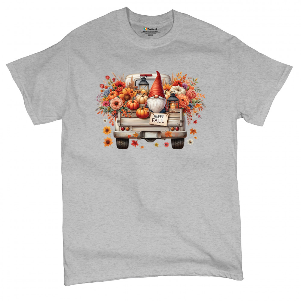 Rustic gnome truck design with pumpkins, wildflowers, and lantern glow. Perfect for Thanksgiving Day, farmhouse harvest, and cozy autumn style.