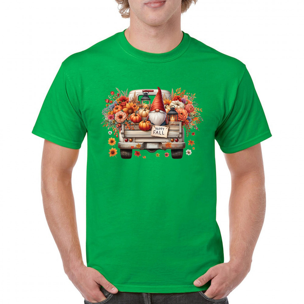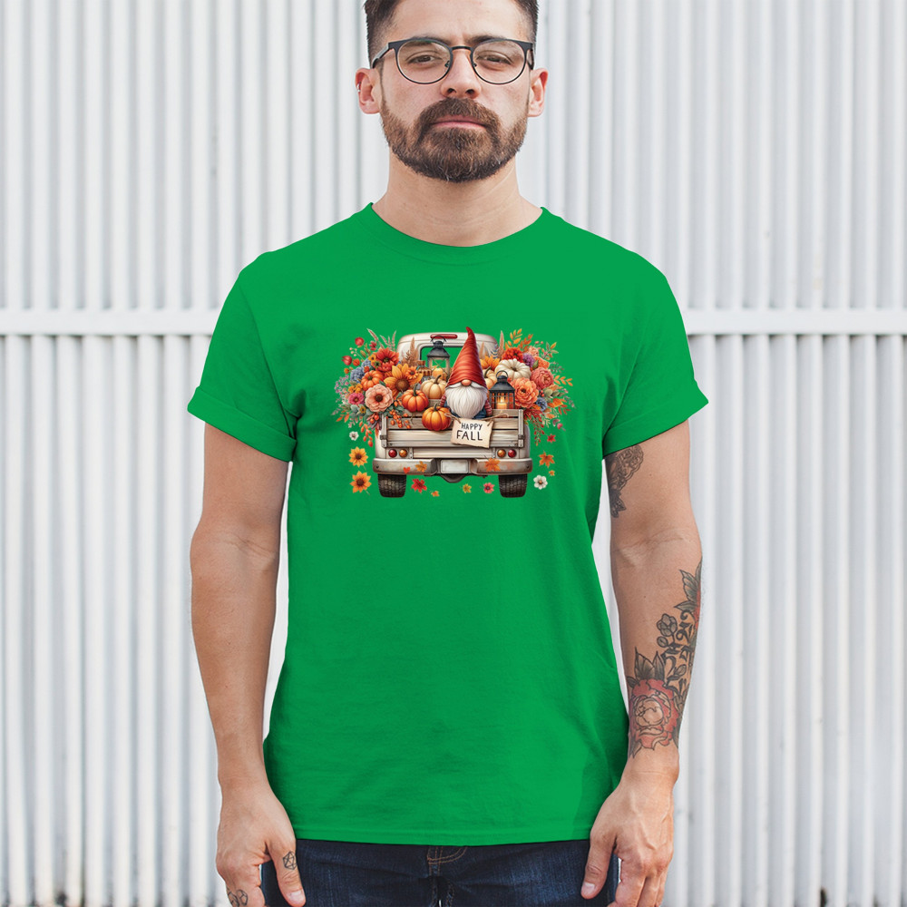 Rustic gnome truck design with pumpkins, wildflowers, and lantern glow. Perfect for Thanksgiving Day, farmhouse harvest, and cozy autumn style.